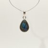 El colgante está enmarcado en un delicado bisel metálico con acabado plateado que rodea la piedra con discreción, asegurando su sujeción sin restarle protagonismo.