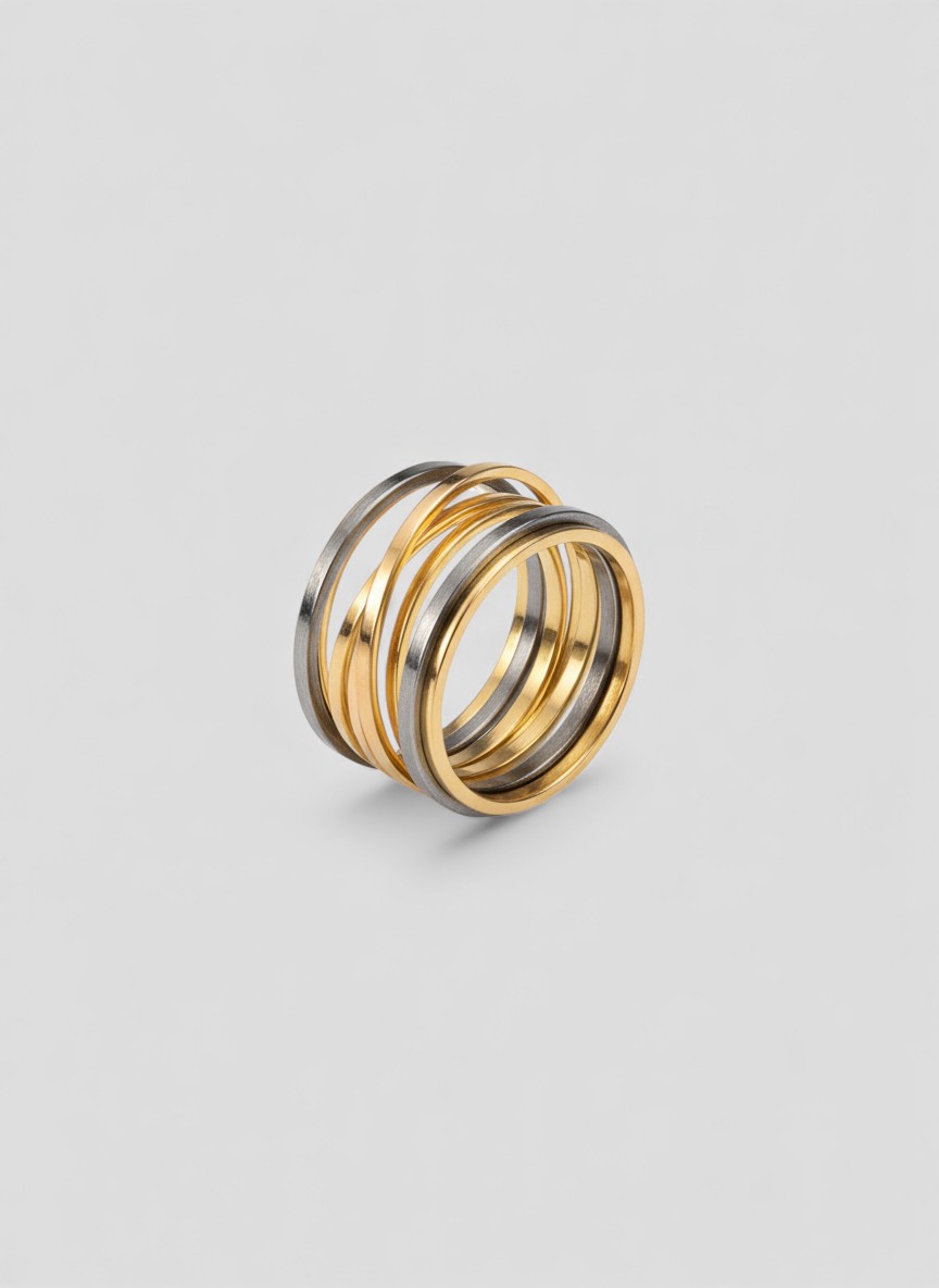 Anillo moderno de múltiples aros entrelazados en tonos dorado y plateado. Un diseño elegante y contemporáneo, ideal para complementar cualquier estilo con un toque sofisticado y llamativo.