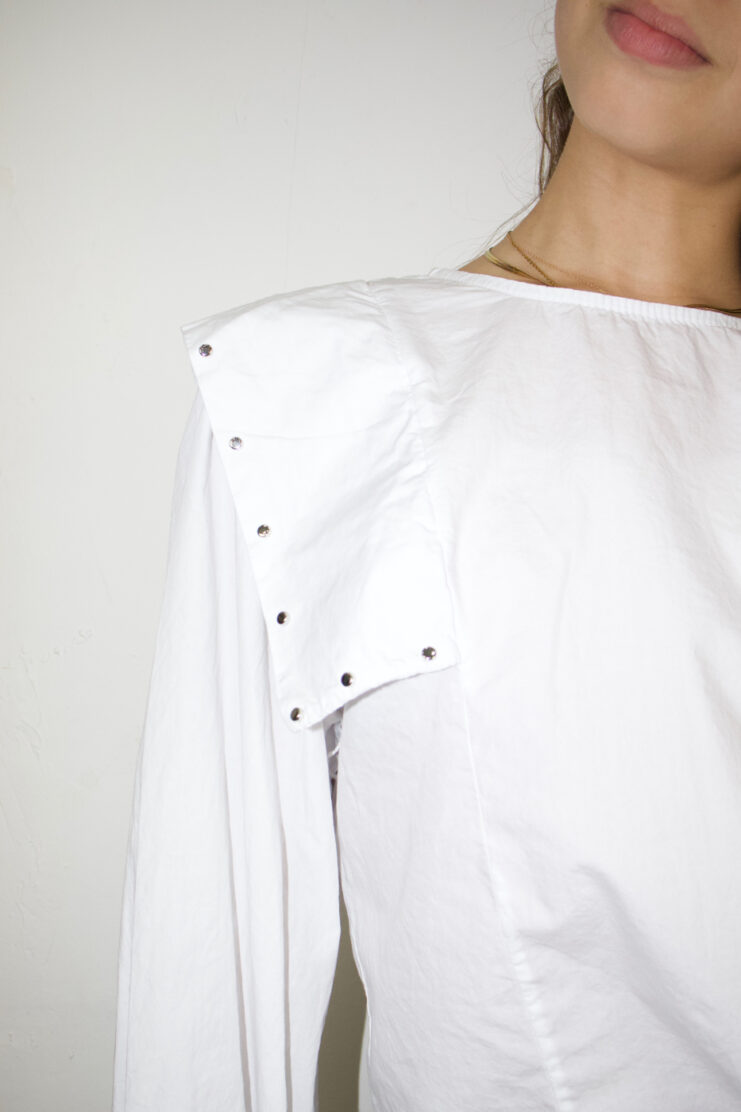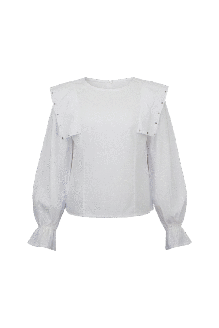 Solapas amplias en los hombros con aplicaciones brillantes que añaden un toque chic.