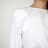 Solapas amplias en los hombros con aplicaciones brillantes que añaden un toque chic.
