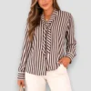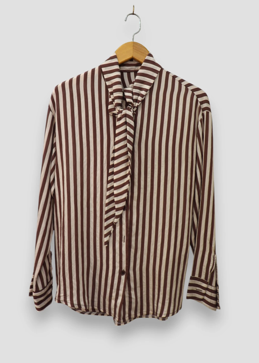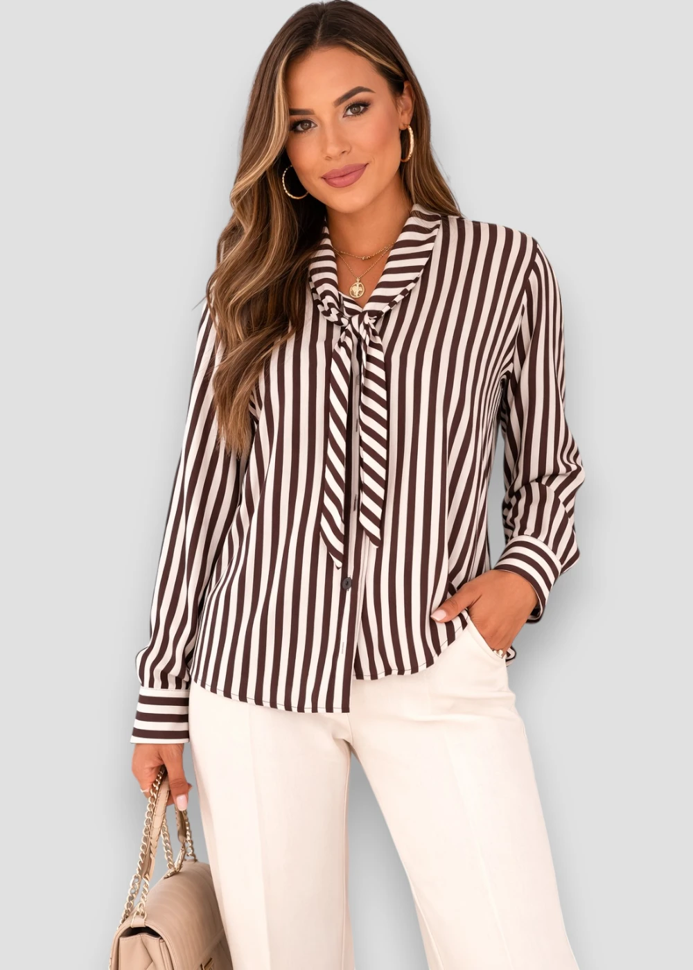 La Blusa Marinera Marrón es una prenda elegante y versátil con rayas verticales en tonos marrón y beige que estilizan la silueta.