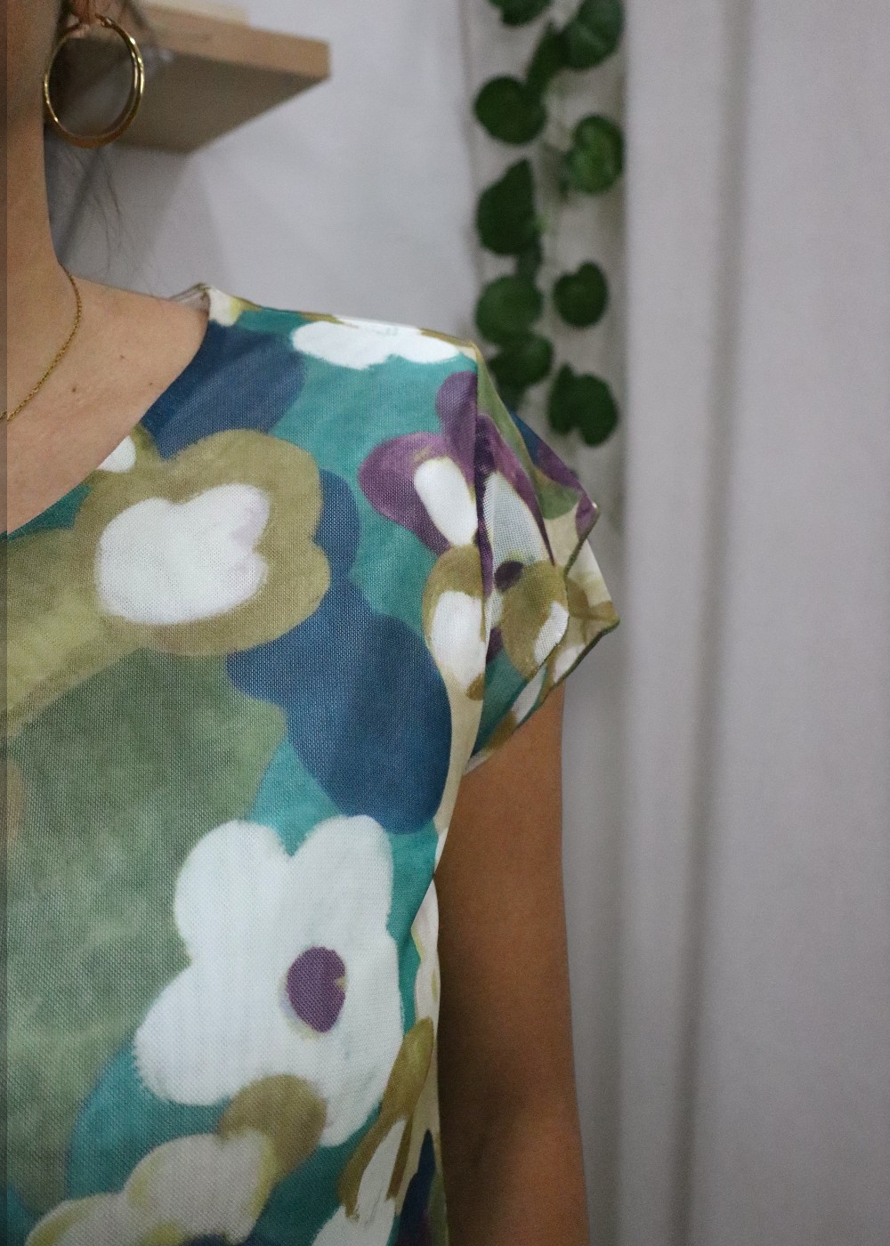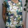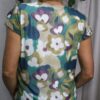 El estampado floral es el protagonista del diseño. Las flores grandes y abstractas aportan un toque moderno y artístico que diferencia a la prenda de las blusas tradicionales.