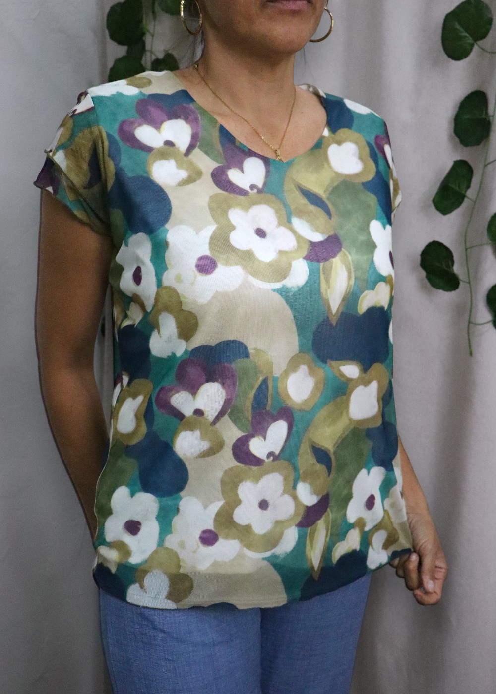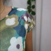 Su diseño destaca por un estampado floral amplio y artístico, donde predominan tonos verdes combinados con matices en blanco, beige, azul y detalles en tonos morados suaves.