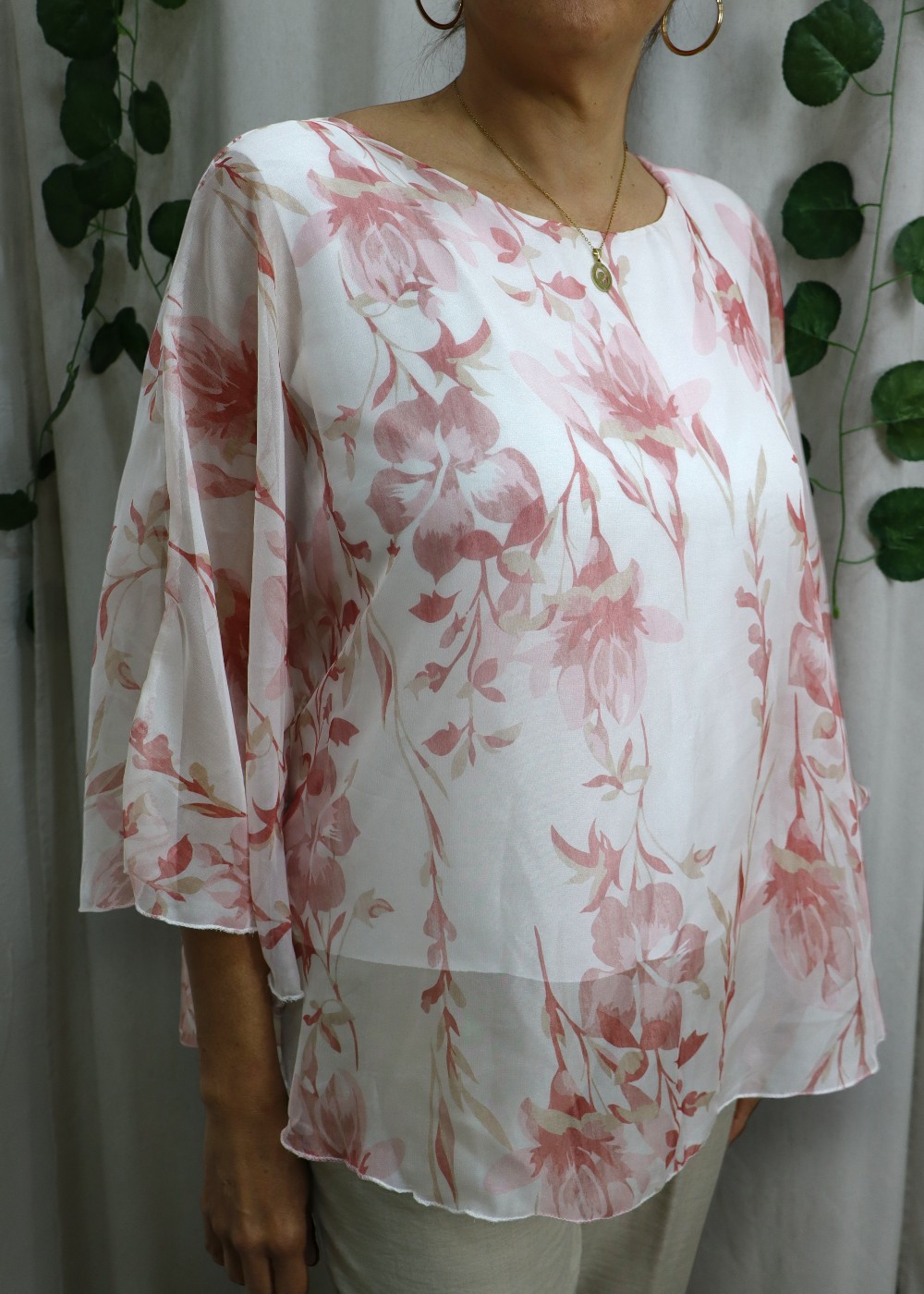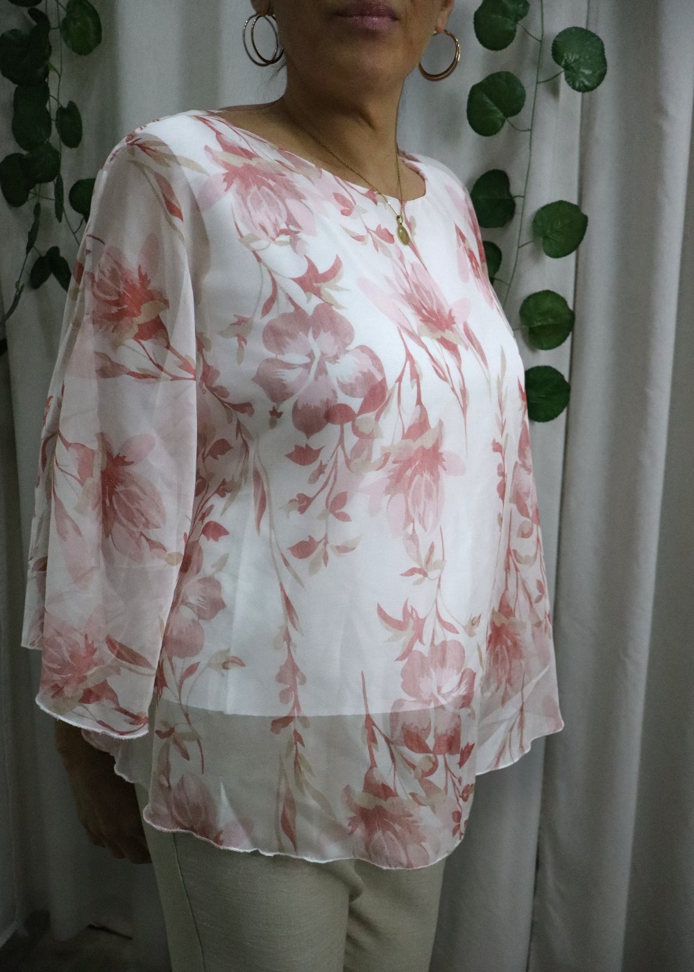 La blusa primaveral rosa es una prenda ligera y elegante con estampado floral en tonos rosa sobre fondo claro, que aporta un estilo delicado y femenino.