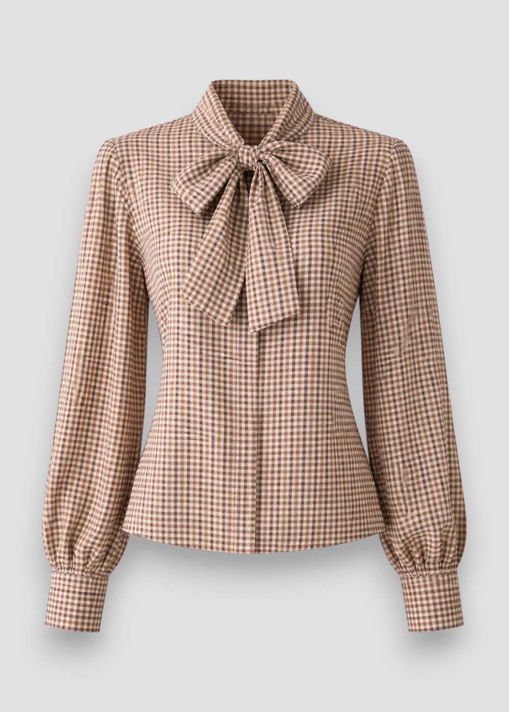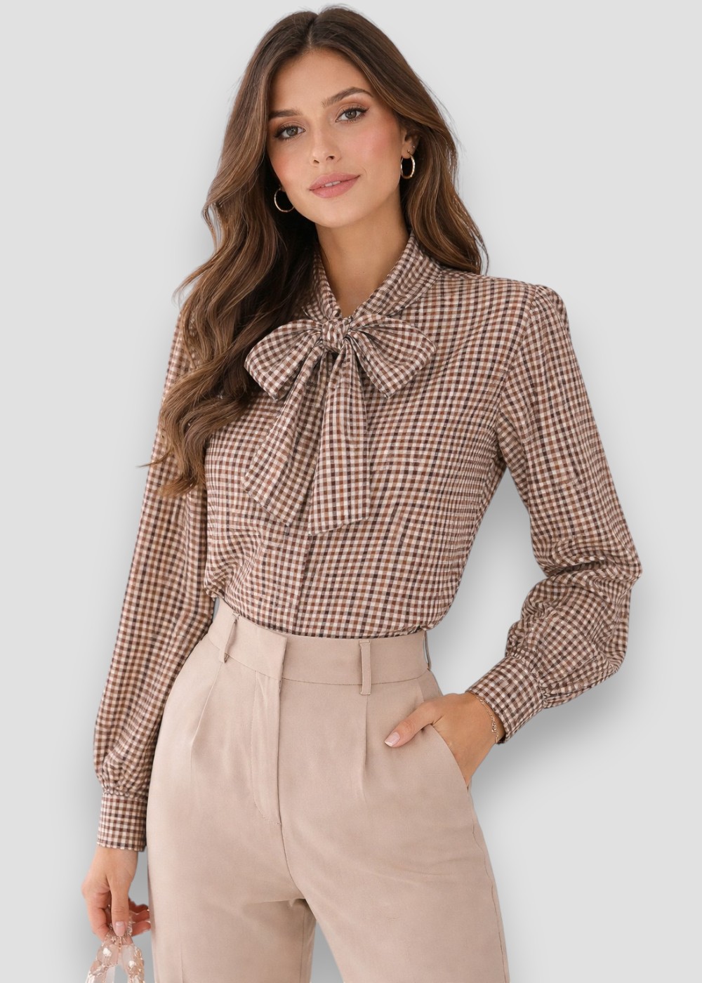 Confeccionada en un tejido ligero y suave al tacto, esta prenda destaca por su estampado de cuadros en tonos neutros, que combina armoniosamente beige y marrón, creando una estética clásica con un aire contemporáneo.