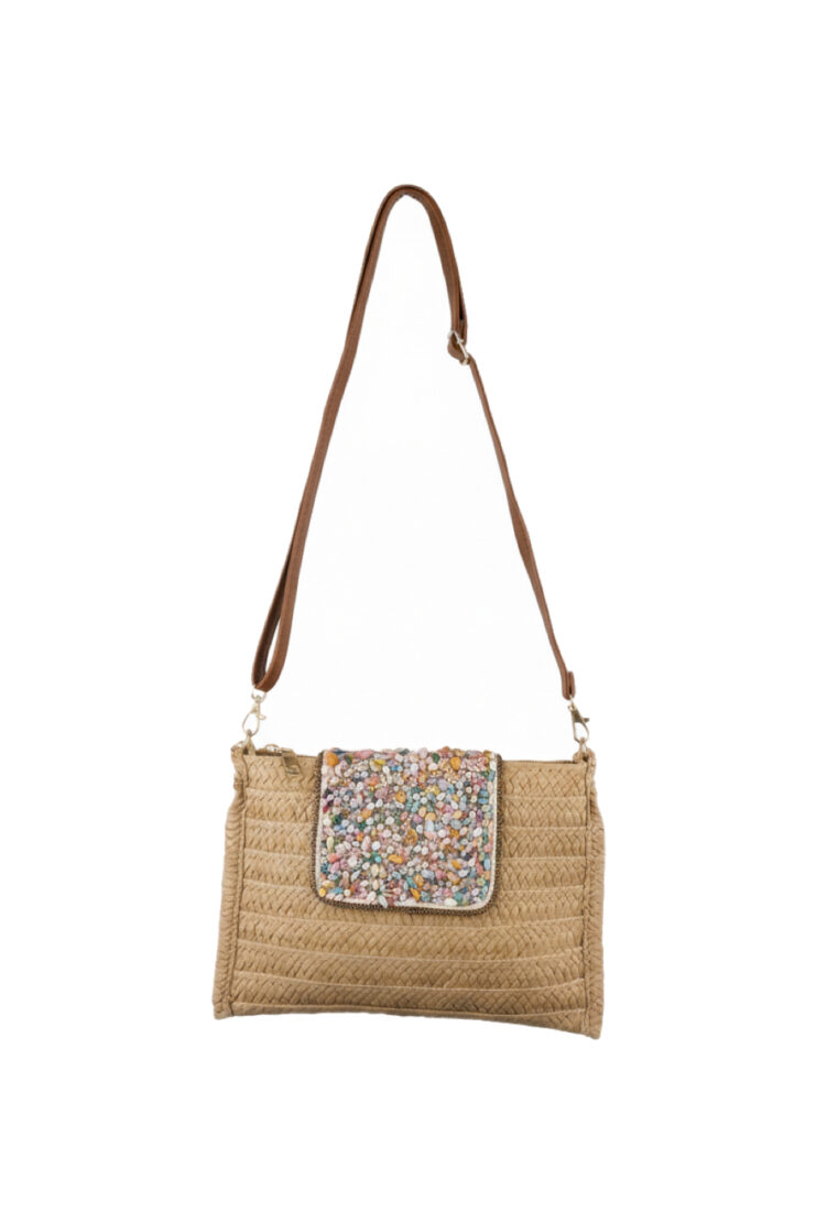 El cuerpo del bolso está confeccionado en mimbre trenzado beige, mientras que la solapa destaca por su aplicación de piedras decorativas que aportan brillo y un toque distintivo. Incluye una correa larga ajustable y desmontable en tono cuero, lo que permite usarlo como bandolera, bolso de hombro o clutch según la ocasión.