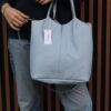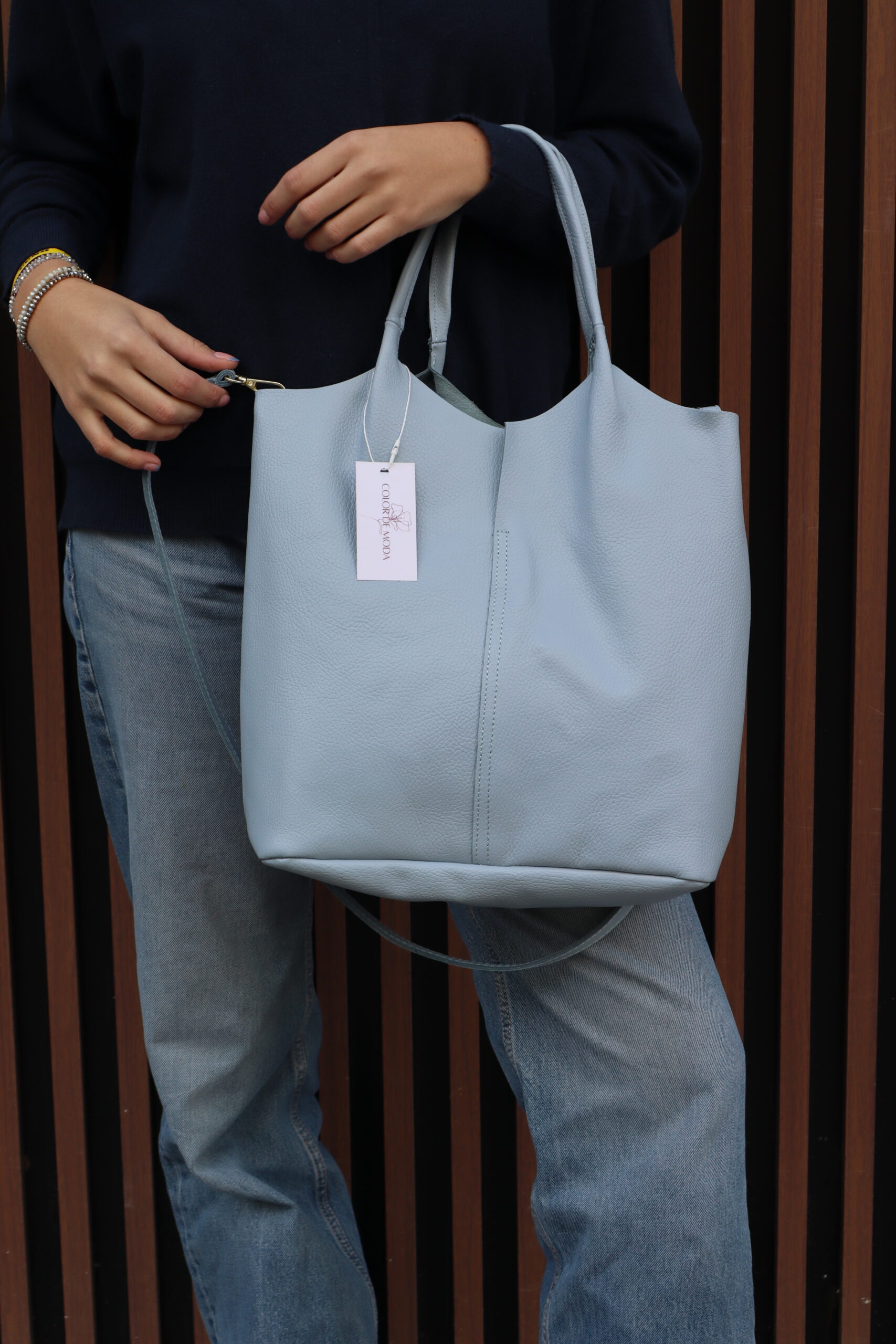 Tejido piel. Tamaño grande . Diseño shopper. Sin cierre. Doble asa larga de mano. Sin bolsillo interior. No forrado.