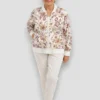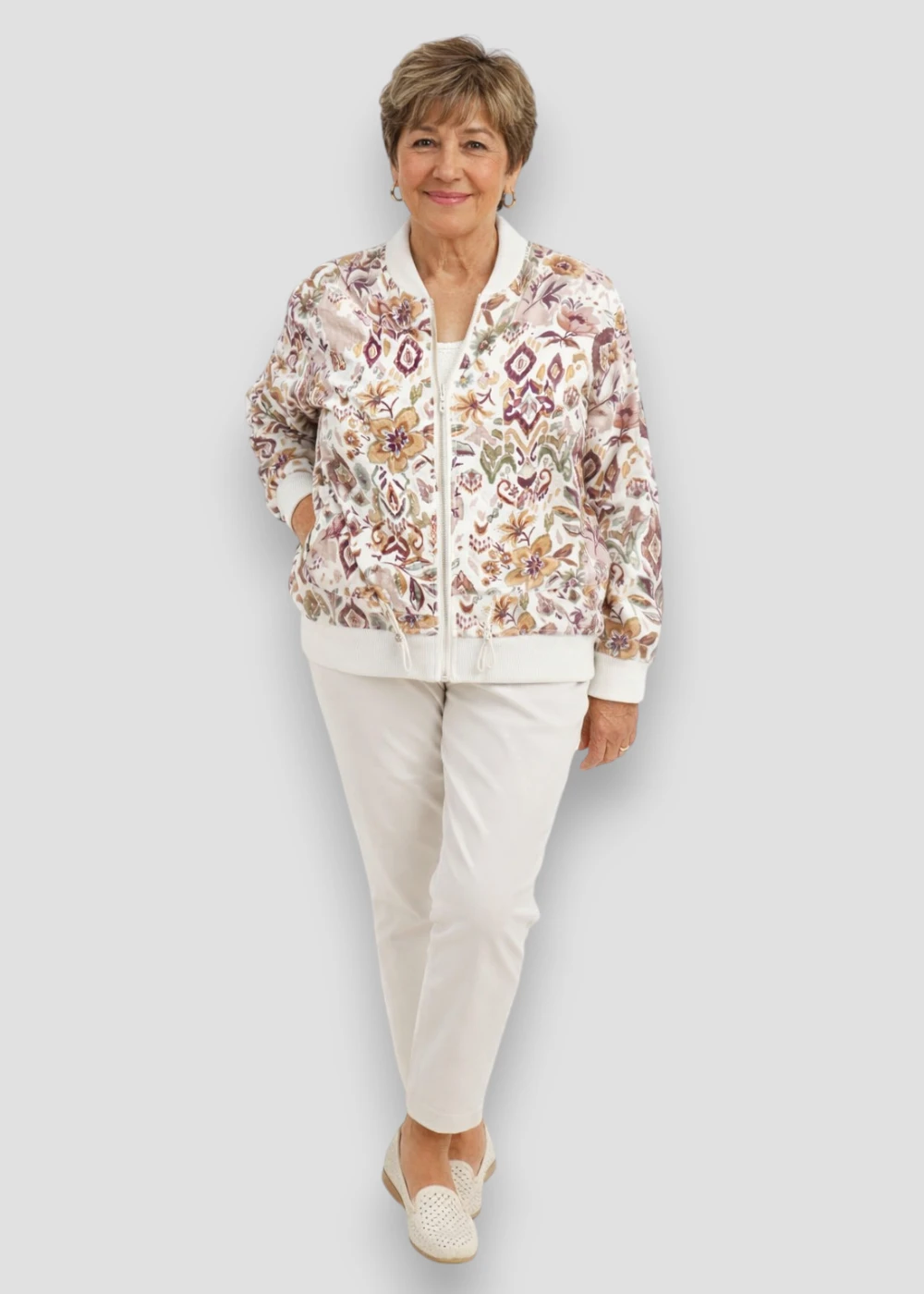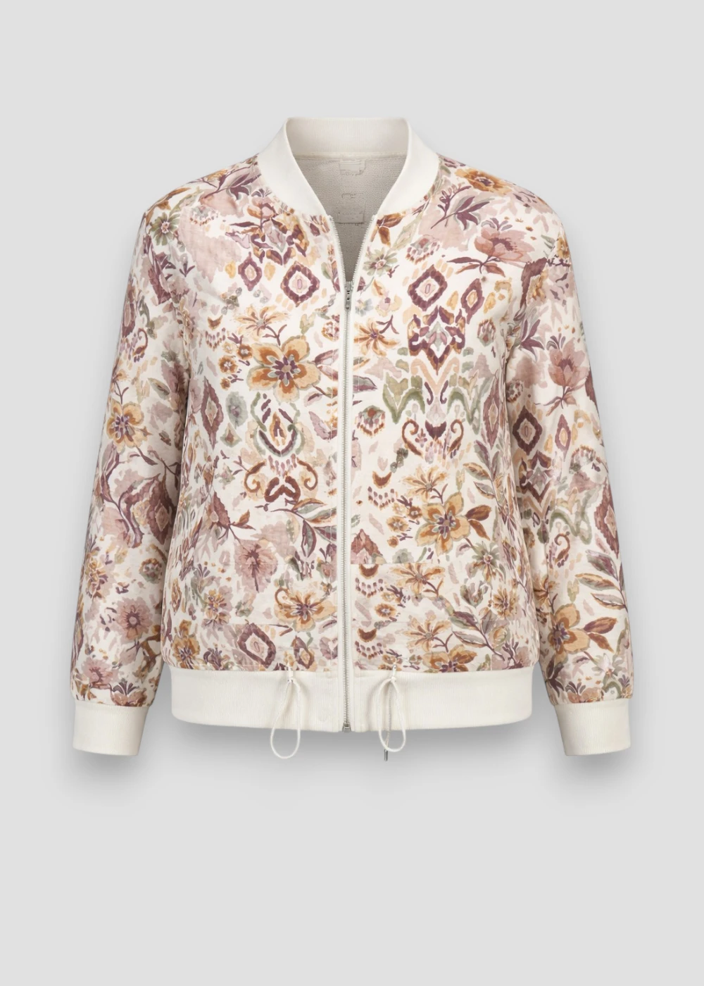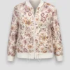 Bomber ligera con estampado floral y geométrico en tonos tierra. Diseño cómodo y versátil con cremallera frontal, ideal para looks de entretiempo con estilo y personalidad.