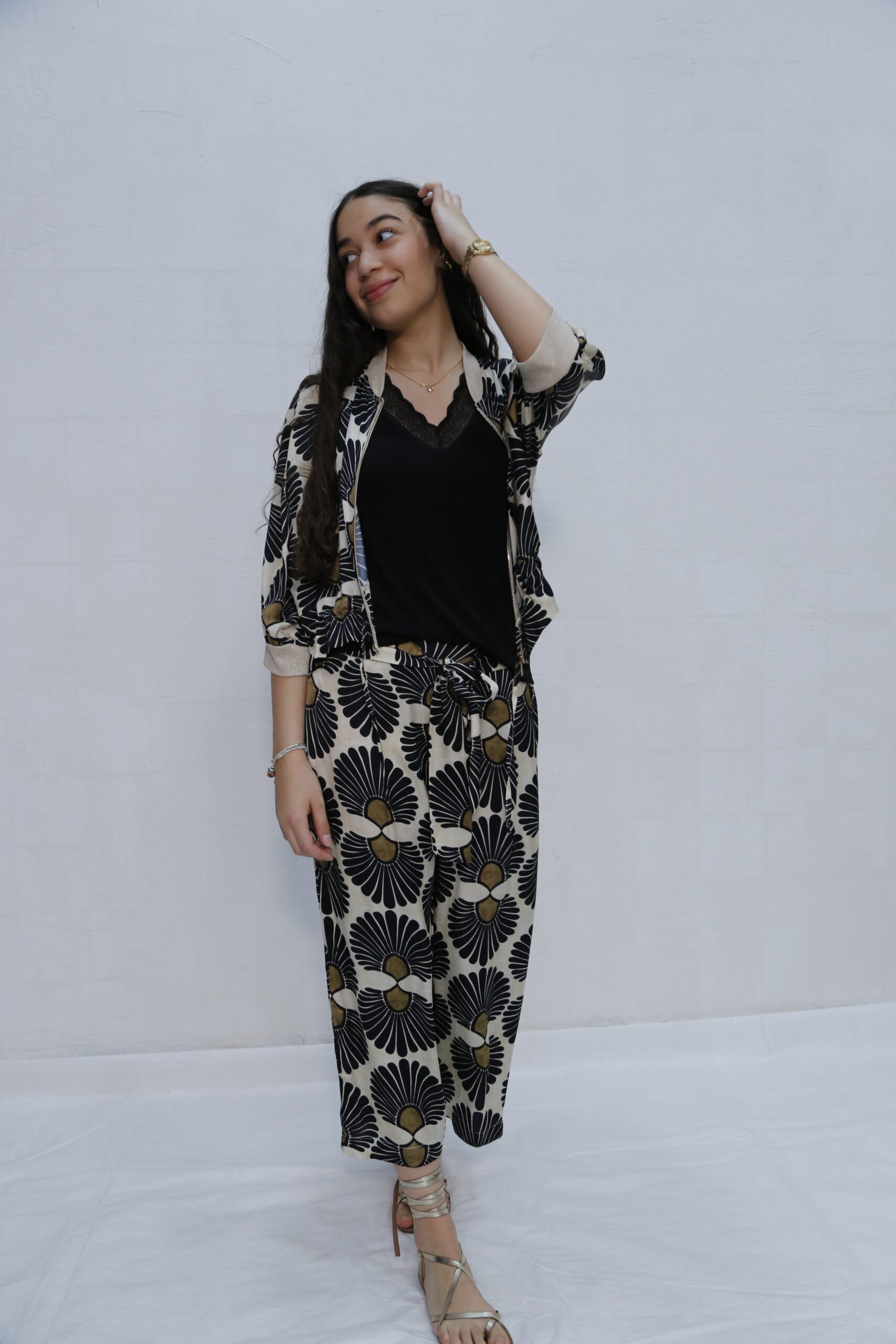 Chaqueta ligera con estampado floral en tonos oscuros y neutros. Con puños acanalados y corte cómodo, es perfecta para elevar cualquier outfit con un toque sofisticado y moderno.