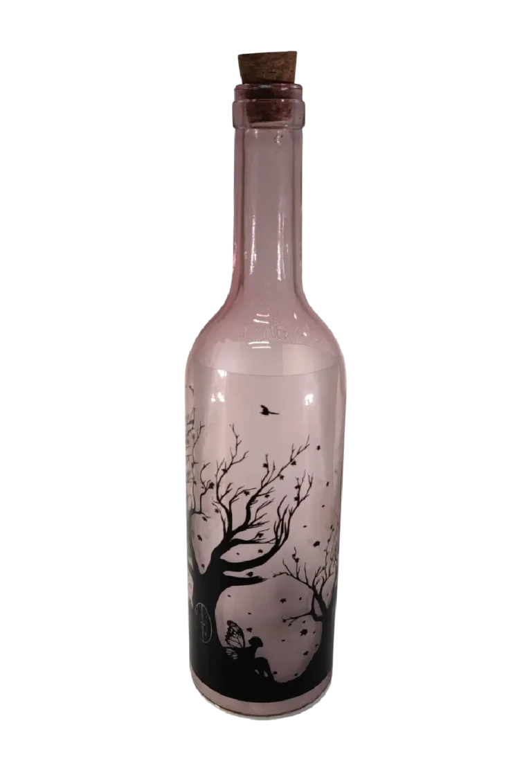 Confeccionada en vidrio de tono suave y coronada con un corcho rústico, esta botella encierra un pequeño mundo de fantasía. En su interior, una tenue luz LED cálida ilumina suavemente un paisaje de árboles sin hojas, estrellas flotantes y una dulce hada en contemplación. La silueta de la hada sentada bajo un árbol evoca serenidad, conexión con la naturaleza y un susurro de magia en medio del caos diario.