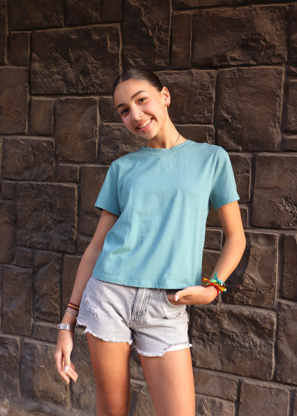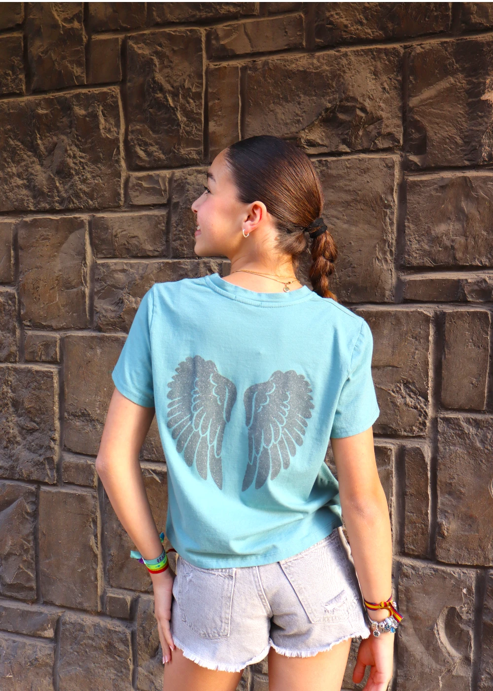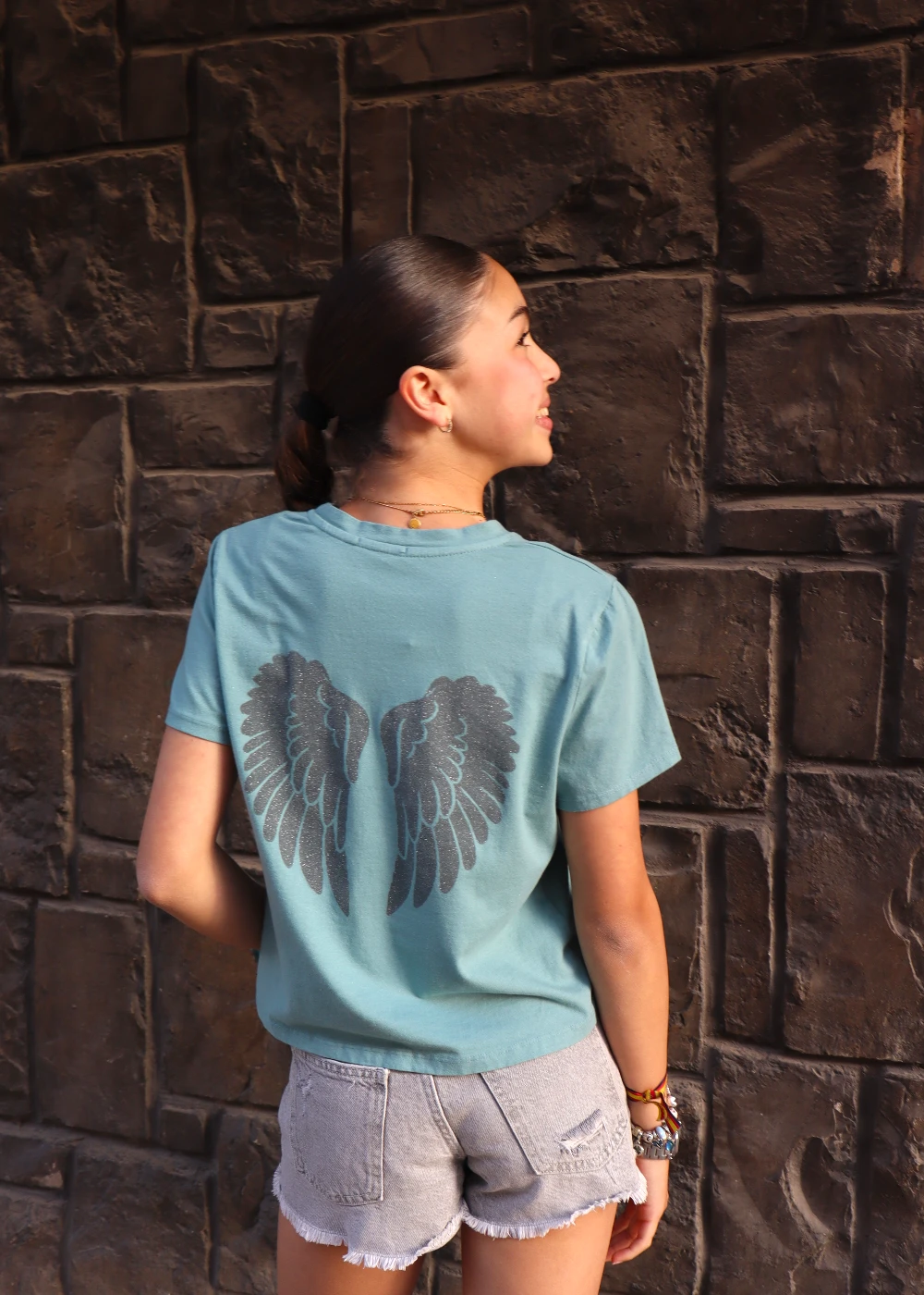 La camiseta Ángel Teen turquesa es muy fácil de combinar con diferentes estilos.
