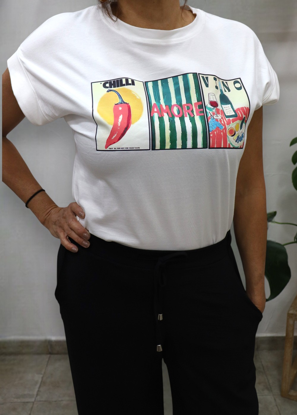 El protagonista del diseño es la palabra “AMORE”, que aporta un aire romántico y alegre a la prenda.