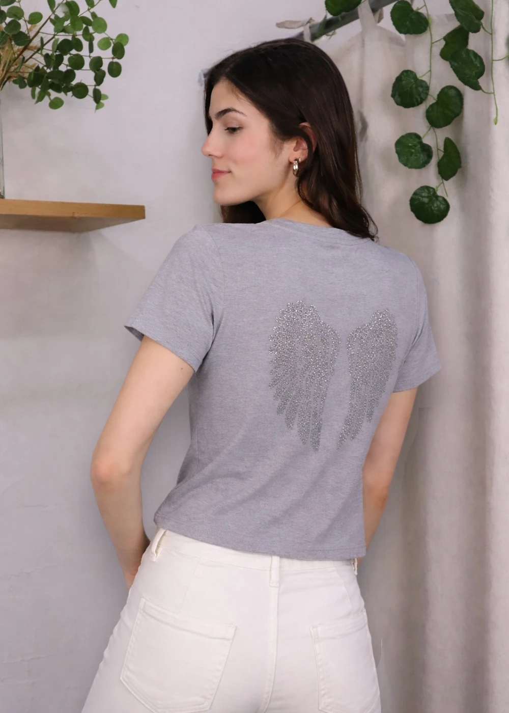 La camiseta Ángel en color gris es una prenda moderna y versátil que destaca por su diseño sencillo con un toque especial que la convierte en una opción ideal para el día a día.