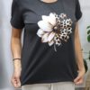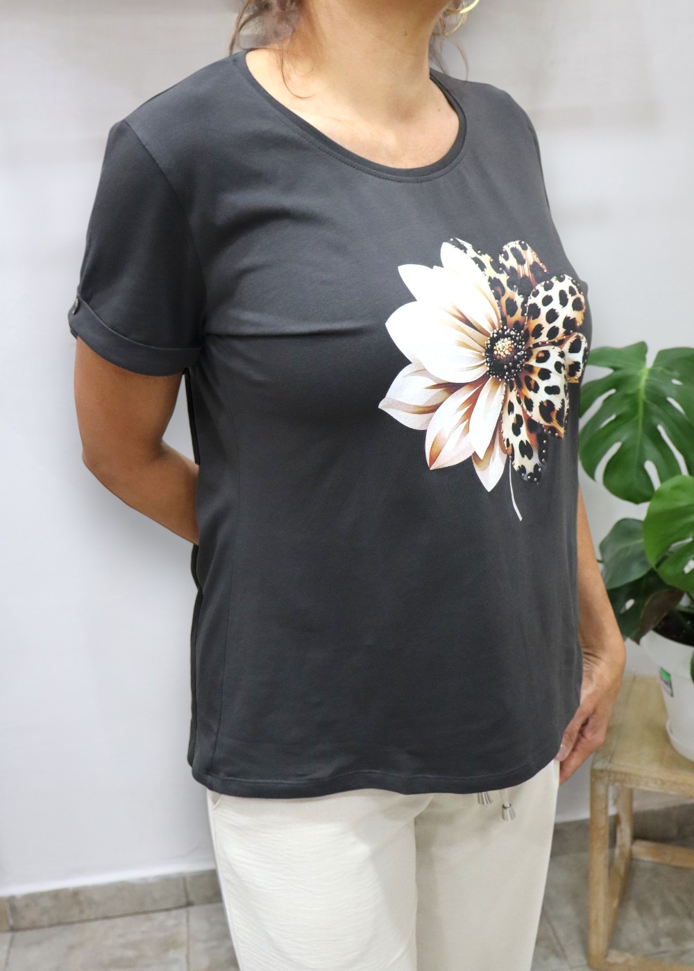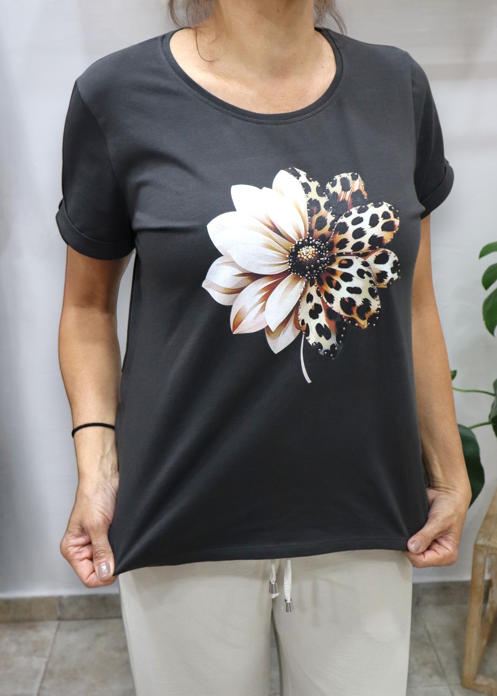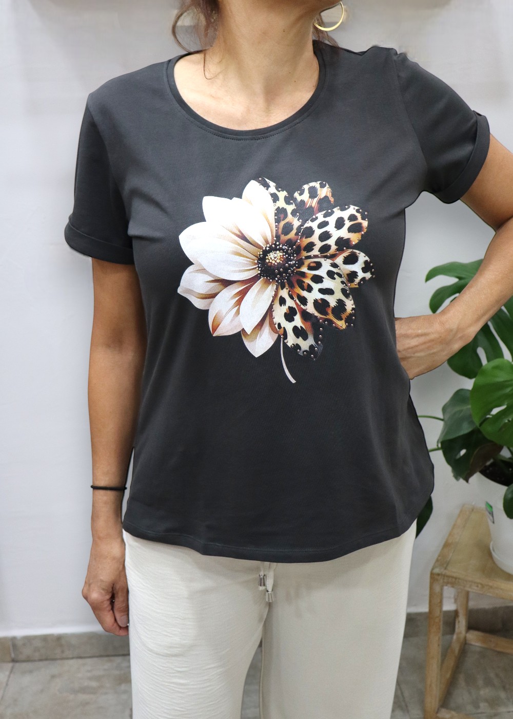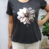 El elemento principal de esta camiseta es su estampado floral con efecto animal print, ubicado en la parte frontal.