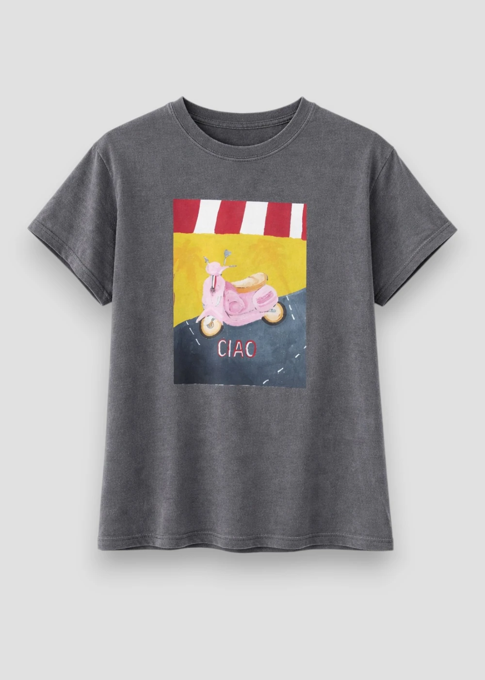 El elemento más llamativo es su estampado frontal, que muestra una ilustración de una motocicleta tipo scooter en color rosa, evocando el clásico estilo italiano.