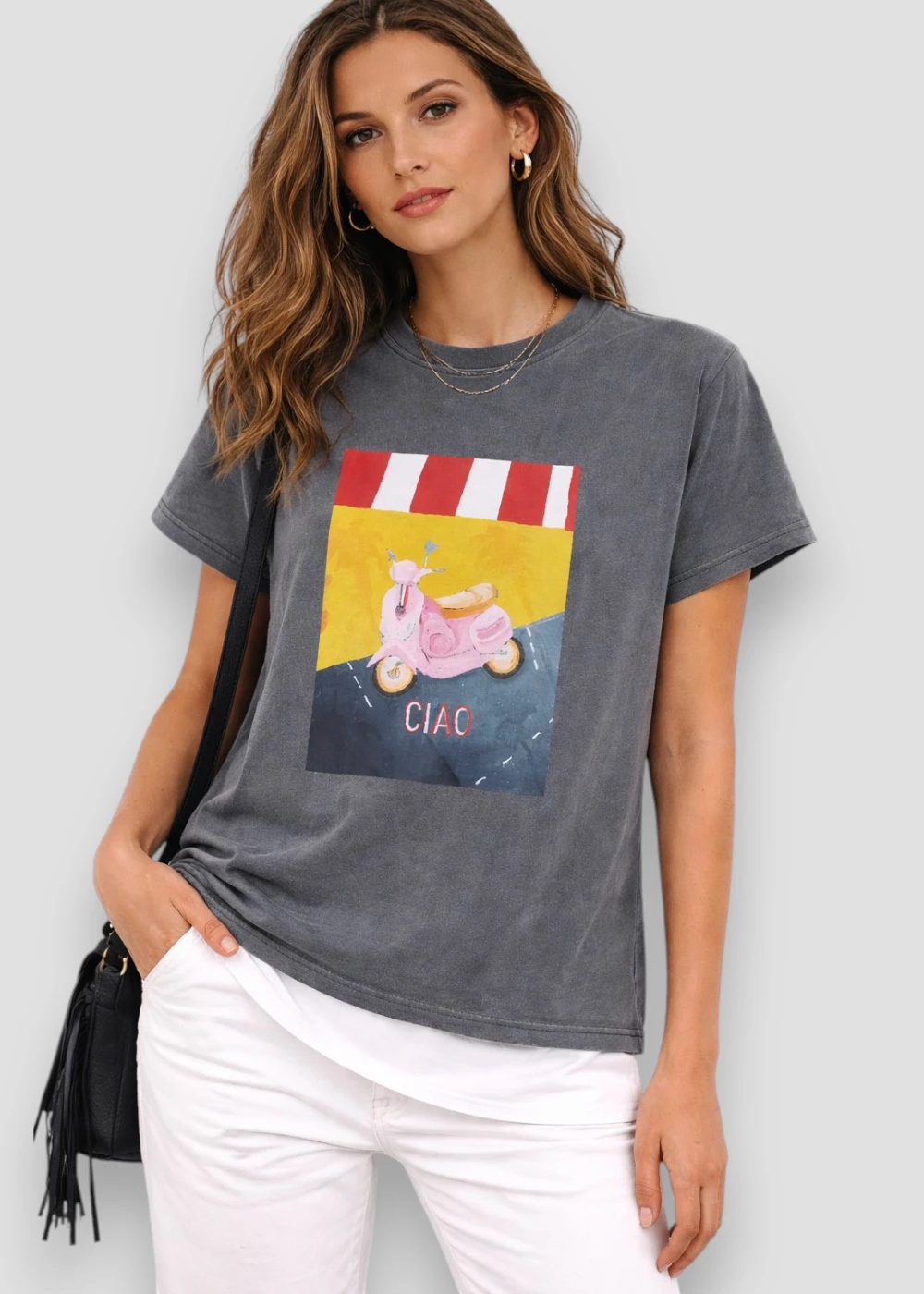 En la parte inferior del gráfico, la palabra “CIAO” refuerza el espíritu italiano y le da un toque divertido y acogedor.