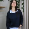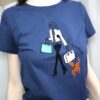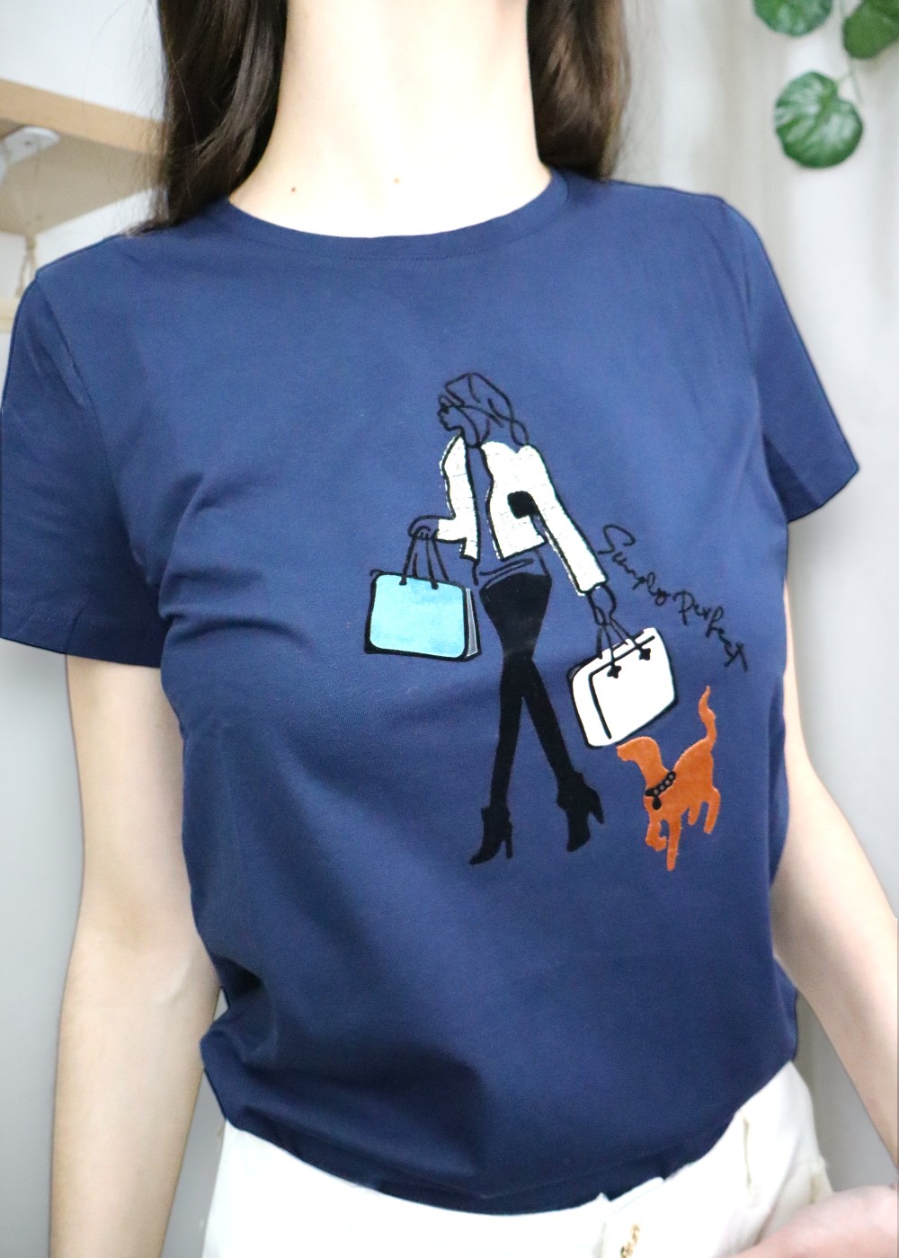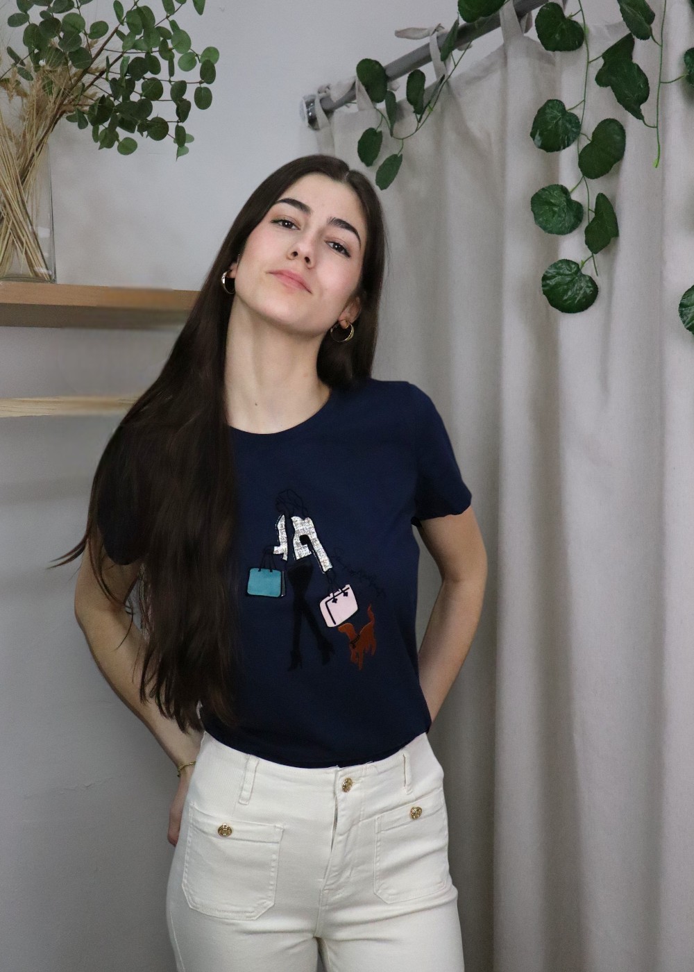 Su color azul profundo y su original estampado frontal inspirado en el mundo de la moda y las compras aportan un toque moderno y divertido.