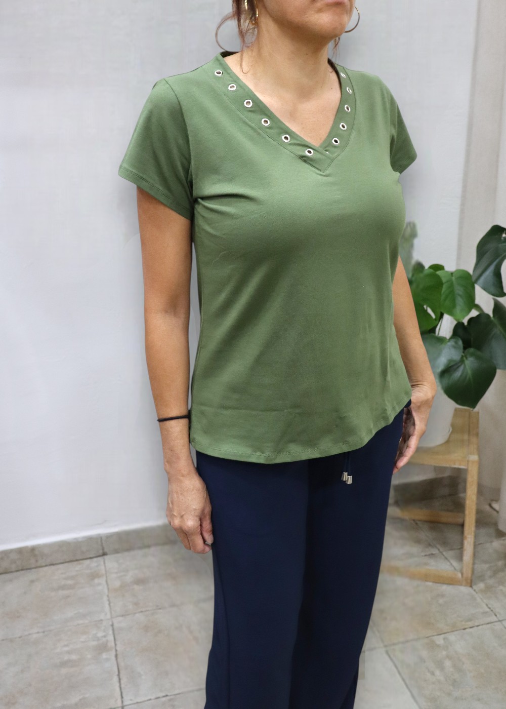 La Camiseta Tachuelas Oliva es una prenda moderna y versátil que destaca por su diseño sencillo con detalles decorativos que aportan personalidad y estilo.