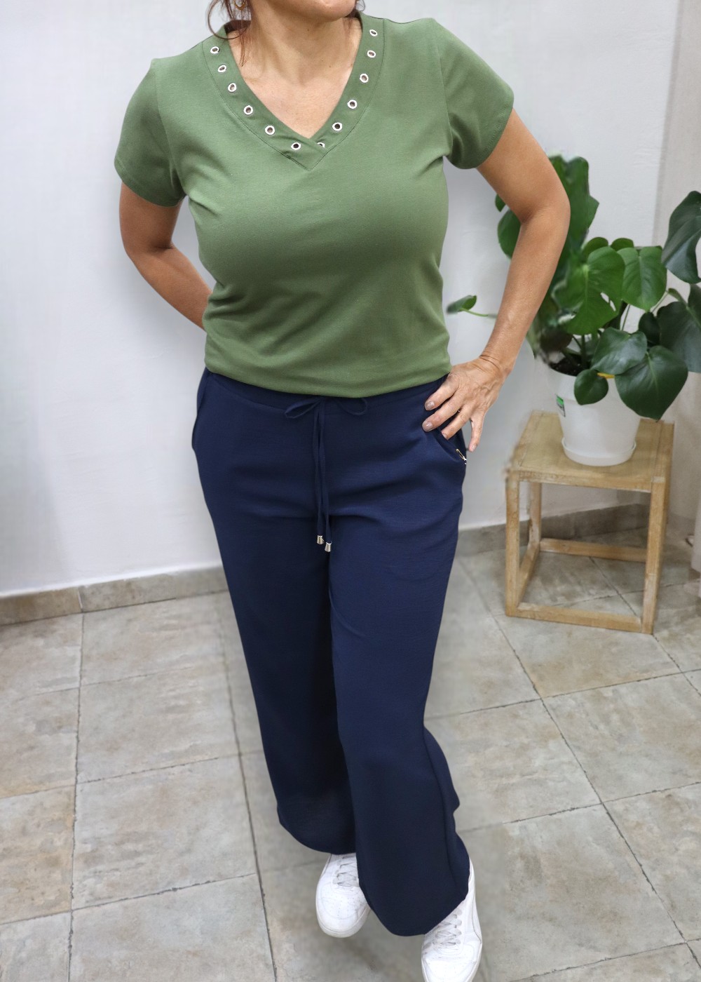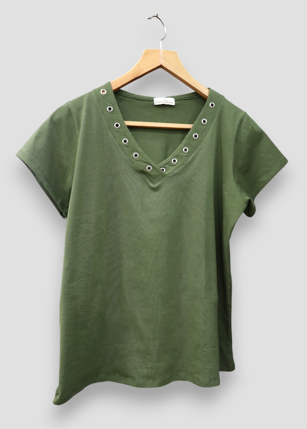 En conjunto, la Camiseta Tachuelas Oliva combina comodidad, estilo y un detalle decorativo moderno, convirtiéndose en una prenda ideal para quienes buscan una camiseta básica con un toque elegante y actual que pueda adaptarse a diferentes ocasiones del día.