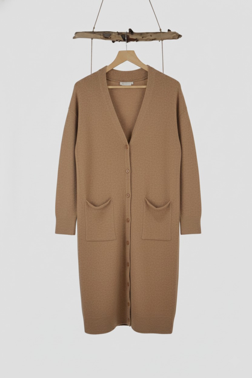 Cárdigan Largo Knit, suave y versátil, con botones frontales y bolsillos amplios. Una prenda cómoda y elegante, ideal para cualquier ocasión.