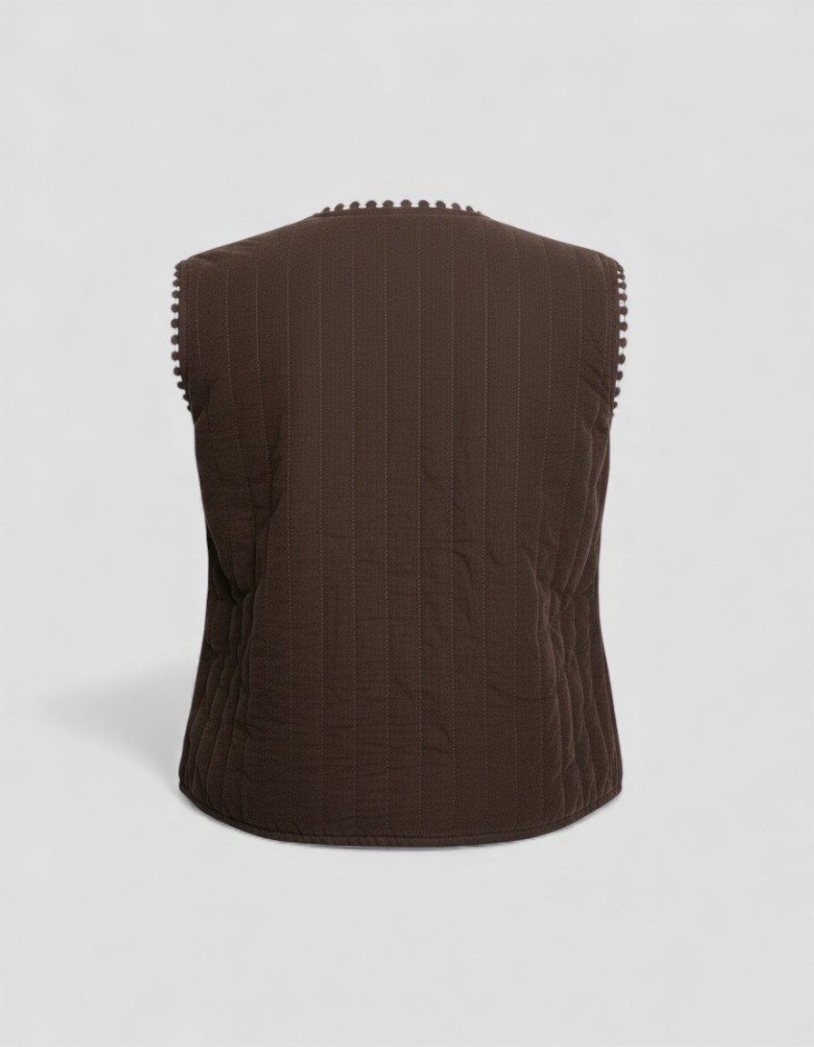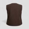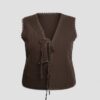 El cierre frontal con lazos del mismo tejido permite ajustarlo a tu gusto: llévalo abierto para un estilo desenfadado o atado para marcar ligeramente la silueta. Su color café chocolate combina con prácticamente todo, desde una camiseta básica blanca hasta blusas vaporosas, vestidos midi o incluso looks más urbanos con denim o pantalones de cuadros.