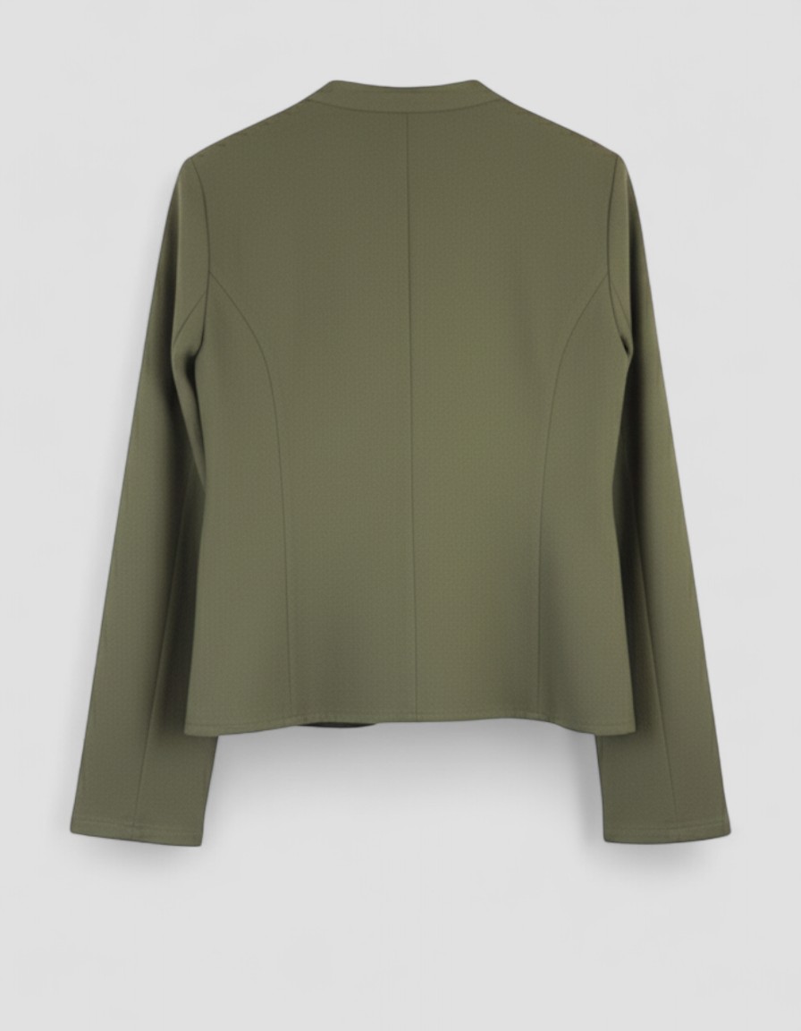 Con un cuello redondo, manga larga y un corte recto que favorece la silueta, esta chaqueta ofrece comodidad y versatilidad. Los dos botones frontales de inspiración natural le añaden un detalle distintivo y sutilmente rústico, manteniendo el equilibrio entre modernidad y estilo artesanal.