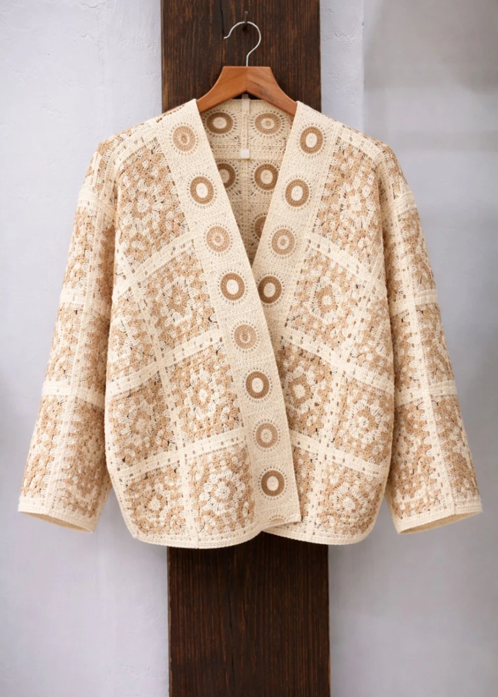 La Chaqueta Crochet Marrón es una prenda elegante y artesanal que destaca por su diseño delicado y su estilo bohemio sofisticado.