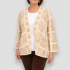 Elaborada con un tejido tipo crochet, esta chaqueta combina patrones decorativos que crean una textura única y visualmente atractiva.