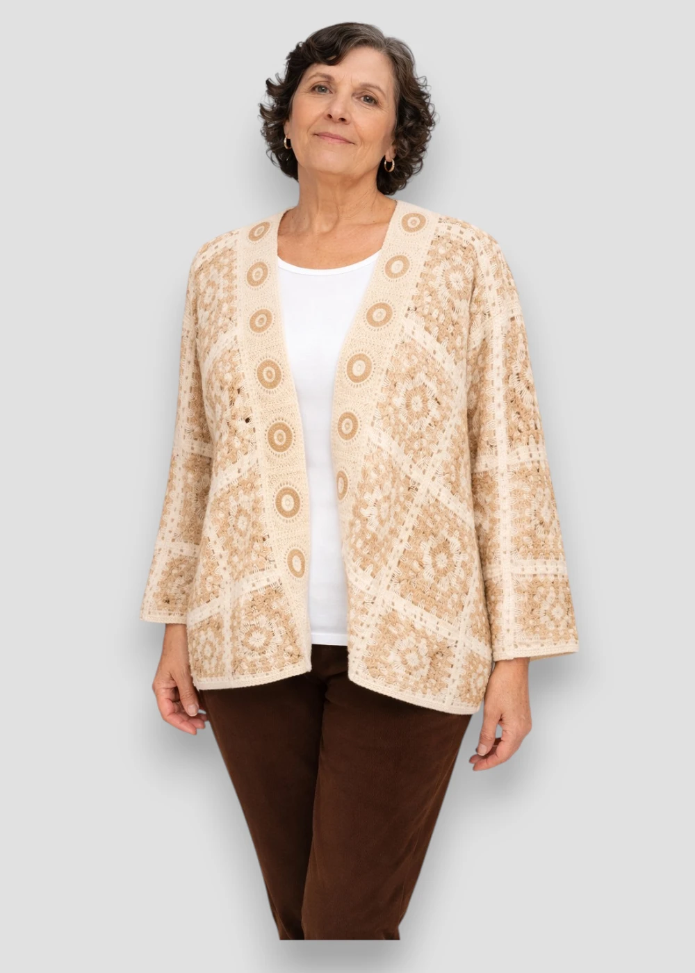 La Chaqueta Crochet Marrón cuenta con mangas largas que ofrecen comodidad y estilo, manteniendo una silueta ligera que no añade volumen excesivo.