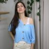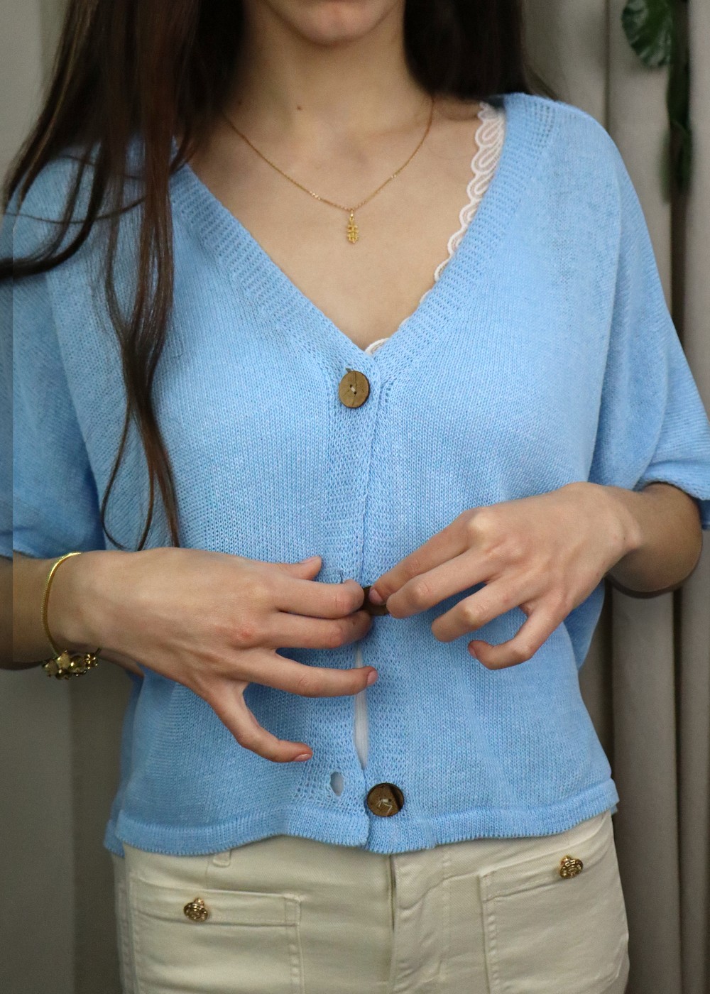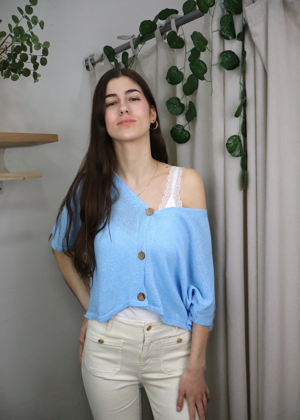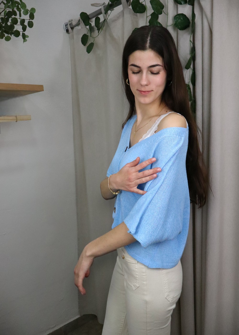 La chaquetilla de punto con botones celeste es una prenda ligera, femenina y versátil que aporta frescura y estilo a cualquier conjunto.