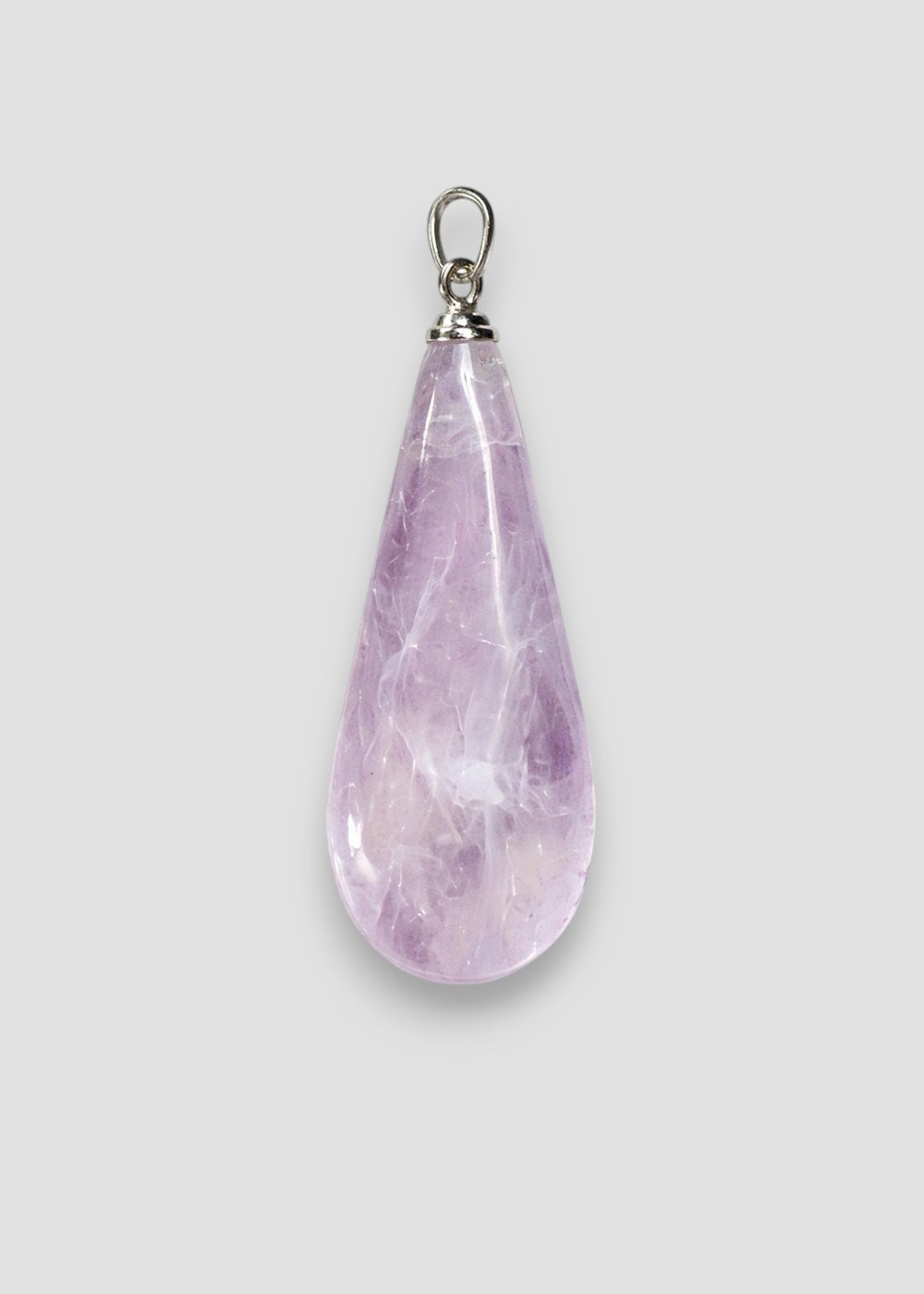 La amatista ha sido cuidadosamente pulida para obtener una forma alargada y estilizada que recuerda a una gota de agua, lo que le aporta un aspecto suave, armonioso y muy atractivo.