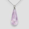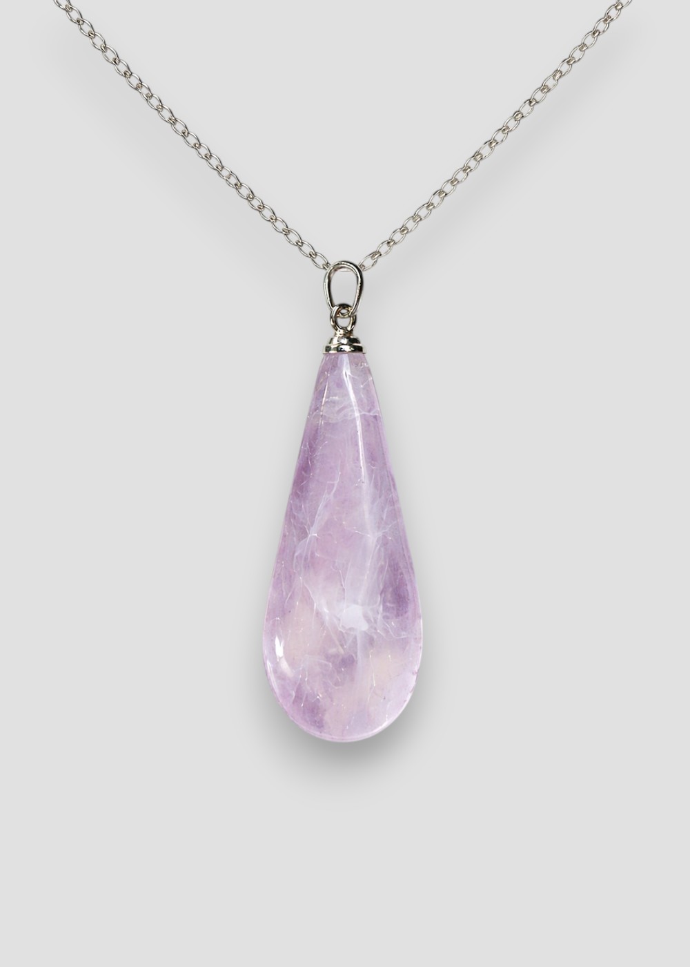Este colgante de amatista en forma de gota larga es una pieza elegante que destaca por la belleza natural de la piedra y su delicado diseño.