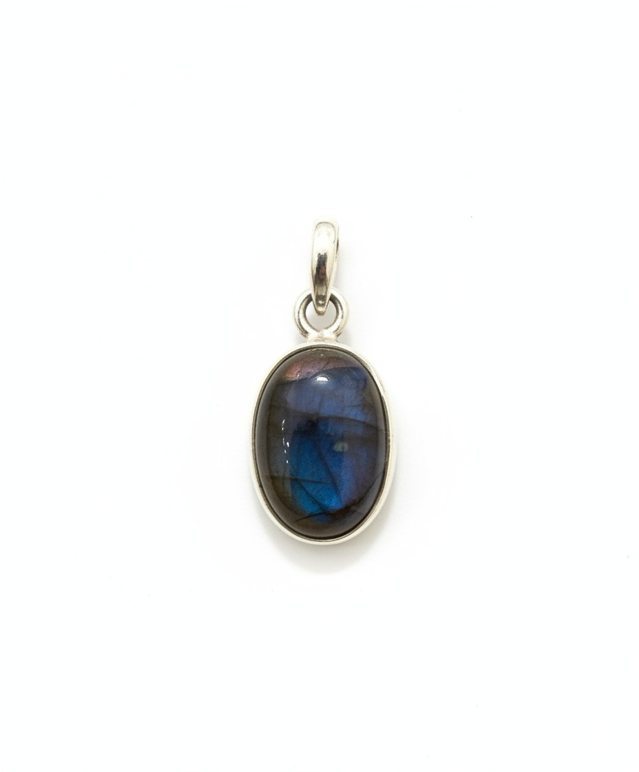 Este colgante de labradorita en forma de óvalo mediano es una pieza elegante que combina sencillez y belleza natural. La piedra está pulida en acabado cabujón, lo que significa que tiene la superficie lisa y ligeramente redondeada. Este tipo de pulido permite que se aprecie mejor su efecto óptico más característico: un brillo especial que aparece cuando la luz incide sobre ella.