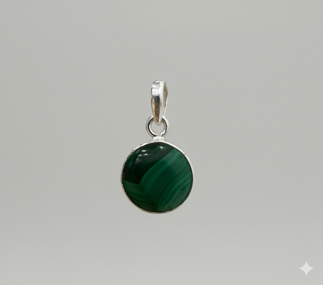 Colgante de malaquita en forma de círculo mediano, una pieza que destaca por la intensidad y profundidad de su color verde.