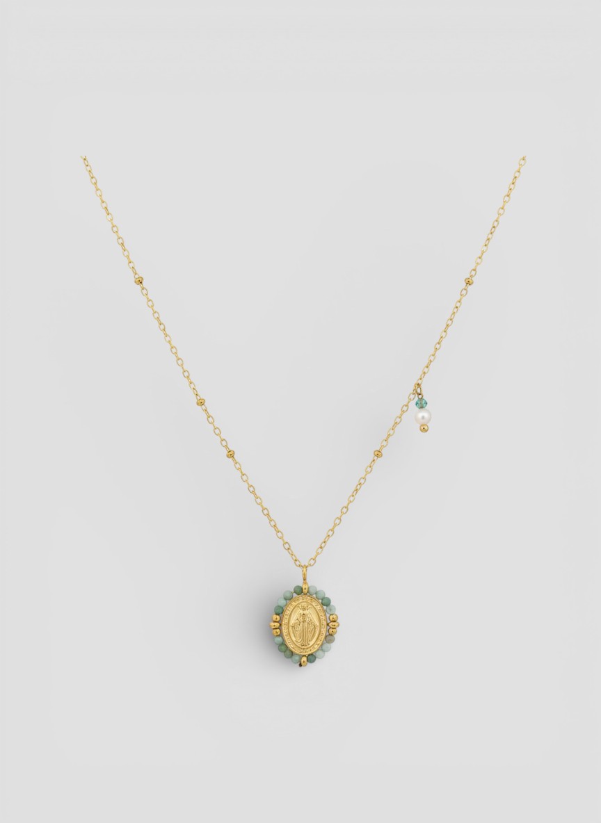 Este collar presenta la icónica imagen de la Virgen de la Medalla Milagrosa, enmarcada artesanalmente con delicadas cuentas de piedra. Una pieza diseñada no solo para complementar tu estilo, sino para acompañarte como un recordatorio de protección diaria.