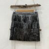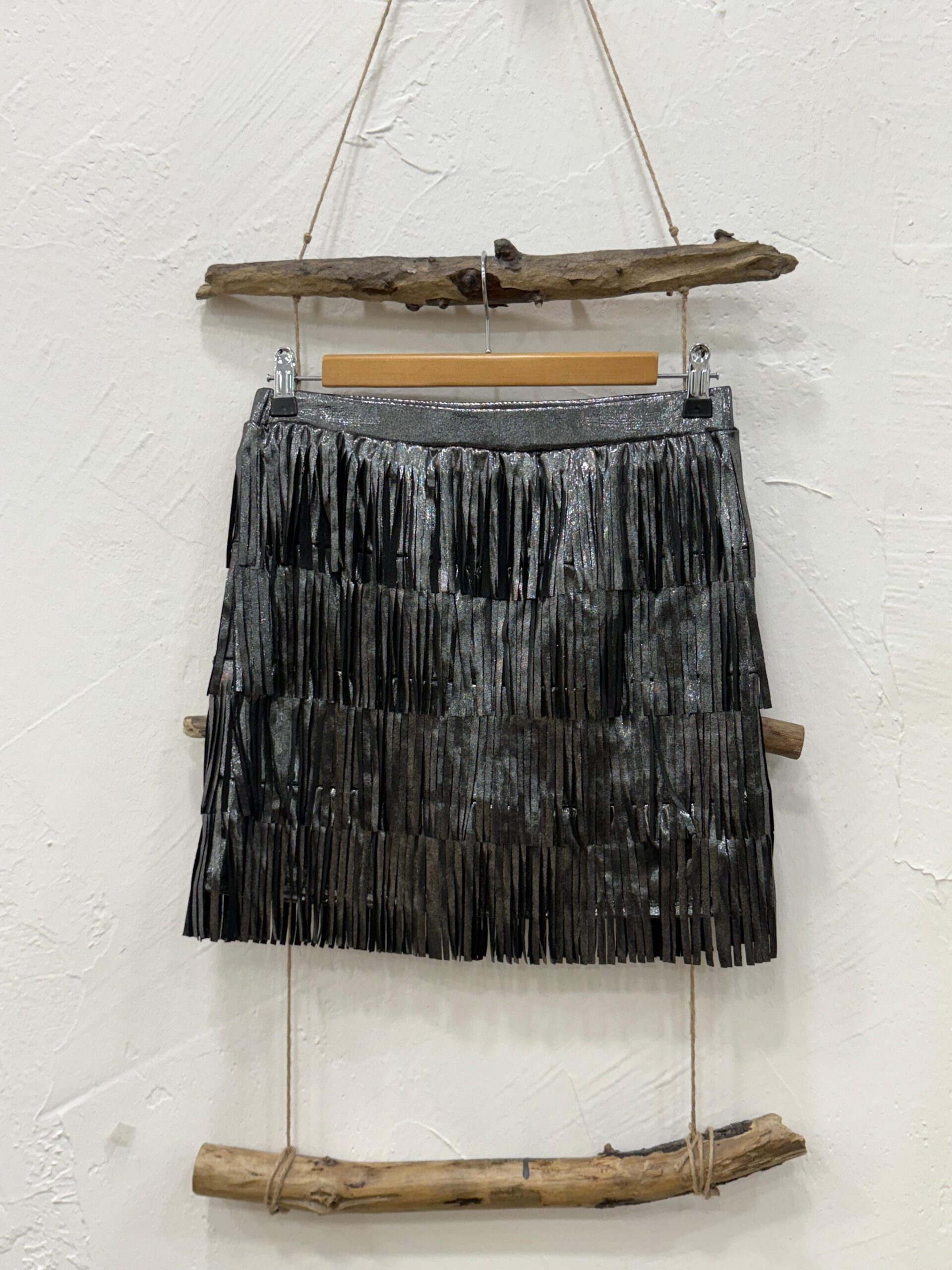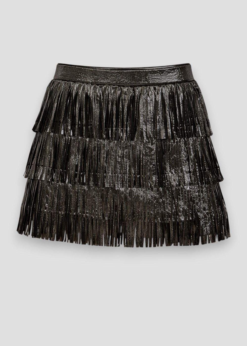 Falda corta de estilo moderno y llamativo, confeccionada en un tejido con acabado metalizado en tono negro con destellos plateados que aportan un efecto brillante y sofisticado.