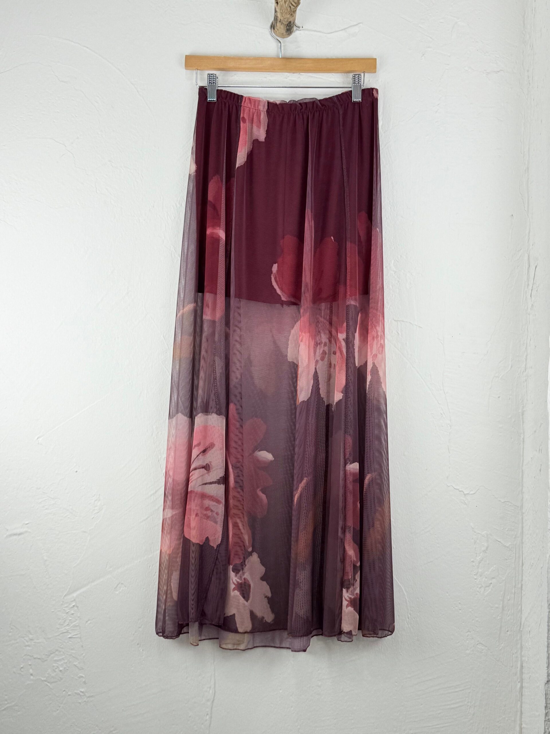 Su diseño incorpora un estampado floral en tonos burdeos, rosados y matices suaves que se integran armoniosamente sobre una base translúcida, creando un efecto romántico y refinado.