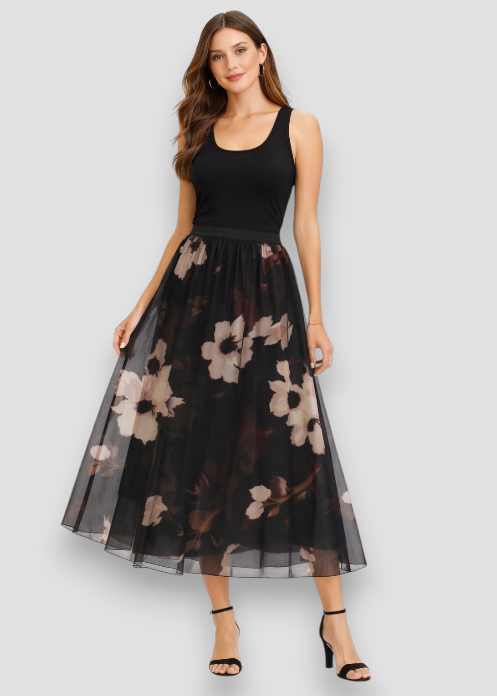La Falda Tul Flora puede combinarse fácilmente con blusas lisas, jerseys finos o tops ajustados que permitan resaltar el protagonismo del estampado.