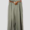 El escote redondeado, clásico y discreto, permite lucir accesorios llamativos como collares largos, que complementan perfectamente el estilo del conjunto.