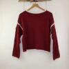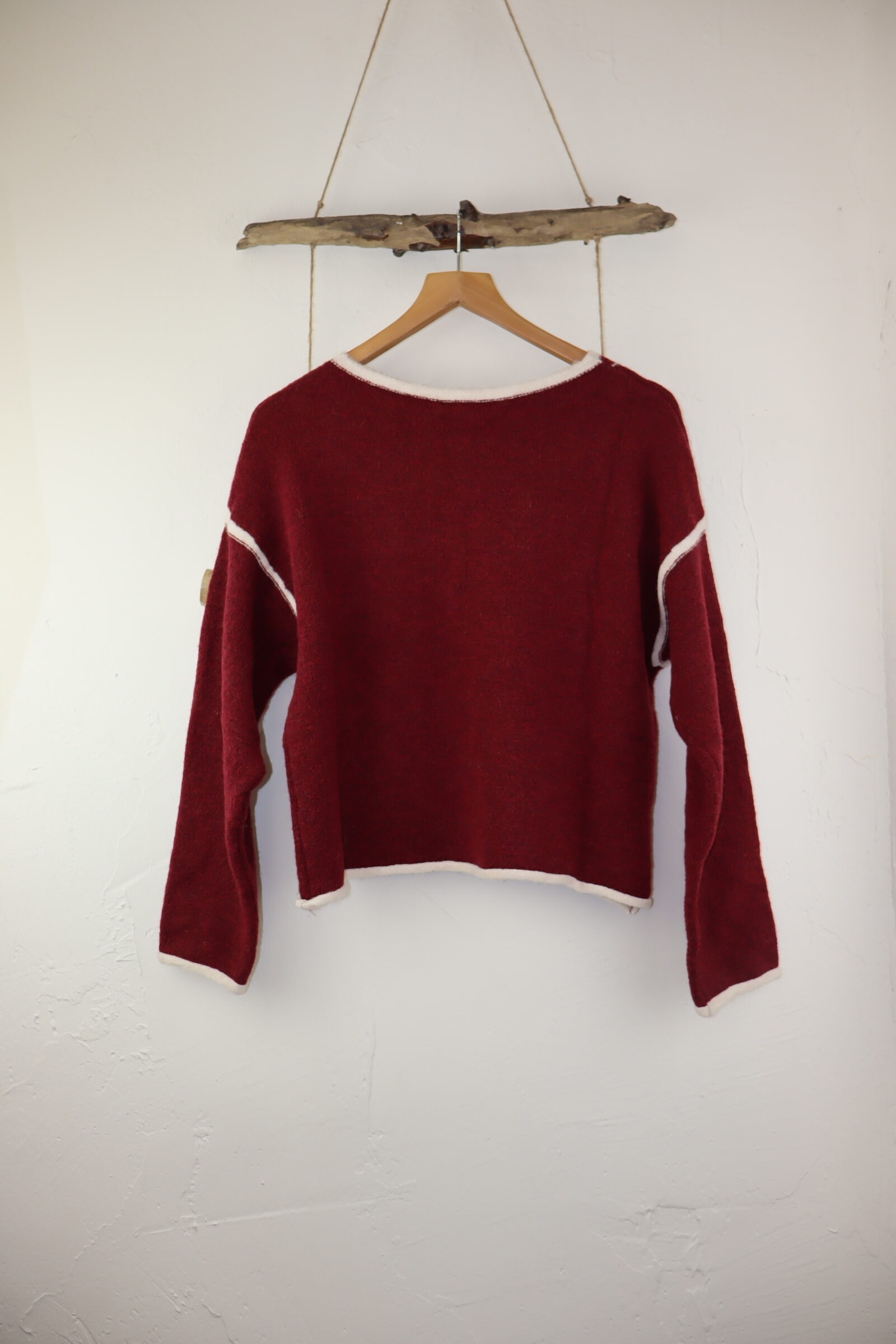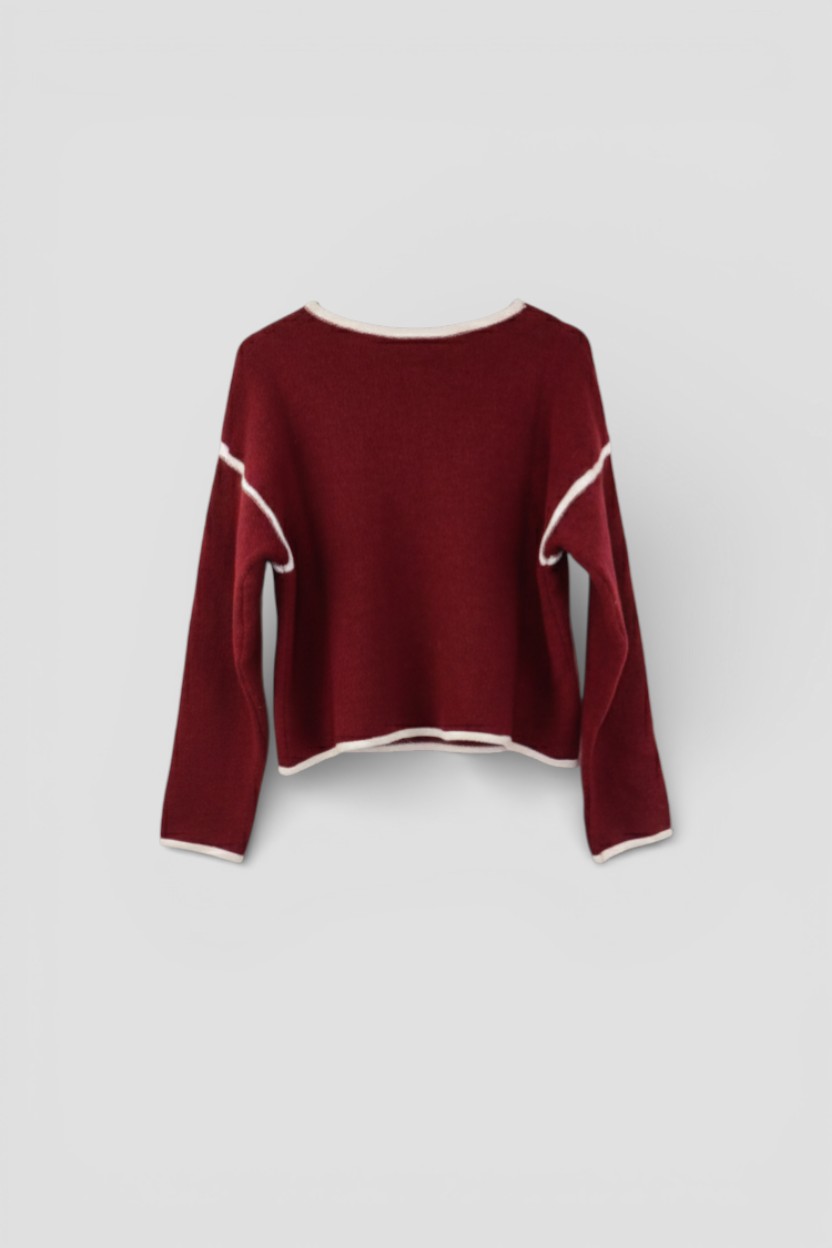 La prenda se presenta como un suéter de estética sobria y artesanal, pensado para quienes valoran la comodidad sin renunciar al carácter. Su color burdeos profundo transmite calidez y elegancia, evocando sensaciones otoñales y una conexión natural con lo hecho a mano. El diseño destaca por sus líneas limpias y equilibradas, donde los detalles en tono claro en los bordes y costuras aportan contraste y definición, realzando la estructura de la pieza sin sobrecargarla.