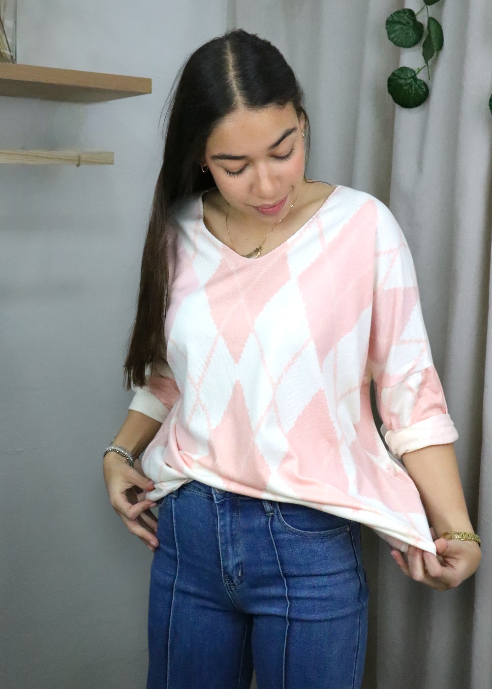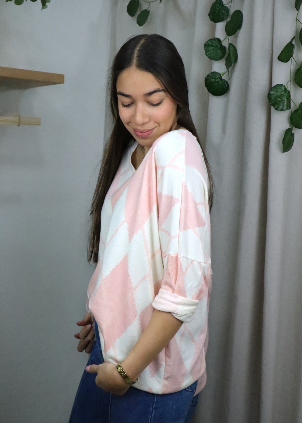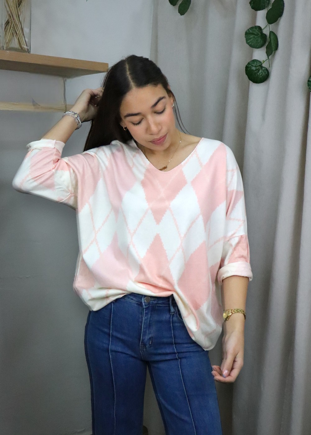 Uno de los aspectos más llamativos de este jersey es su estampado de rombos en tonos rosa suave y blanco, un patrón elegante y atemporal que aporta luminosidad y un toque femenino al look.
