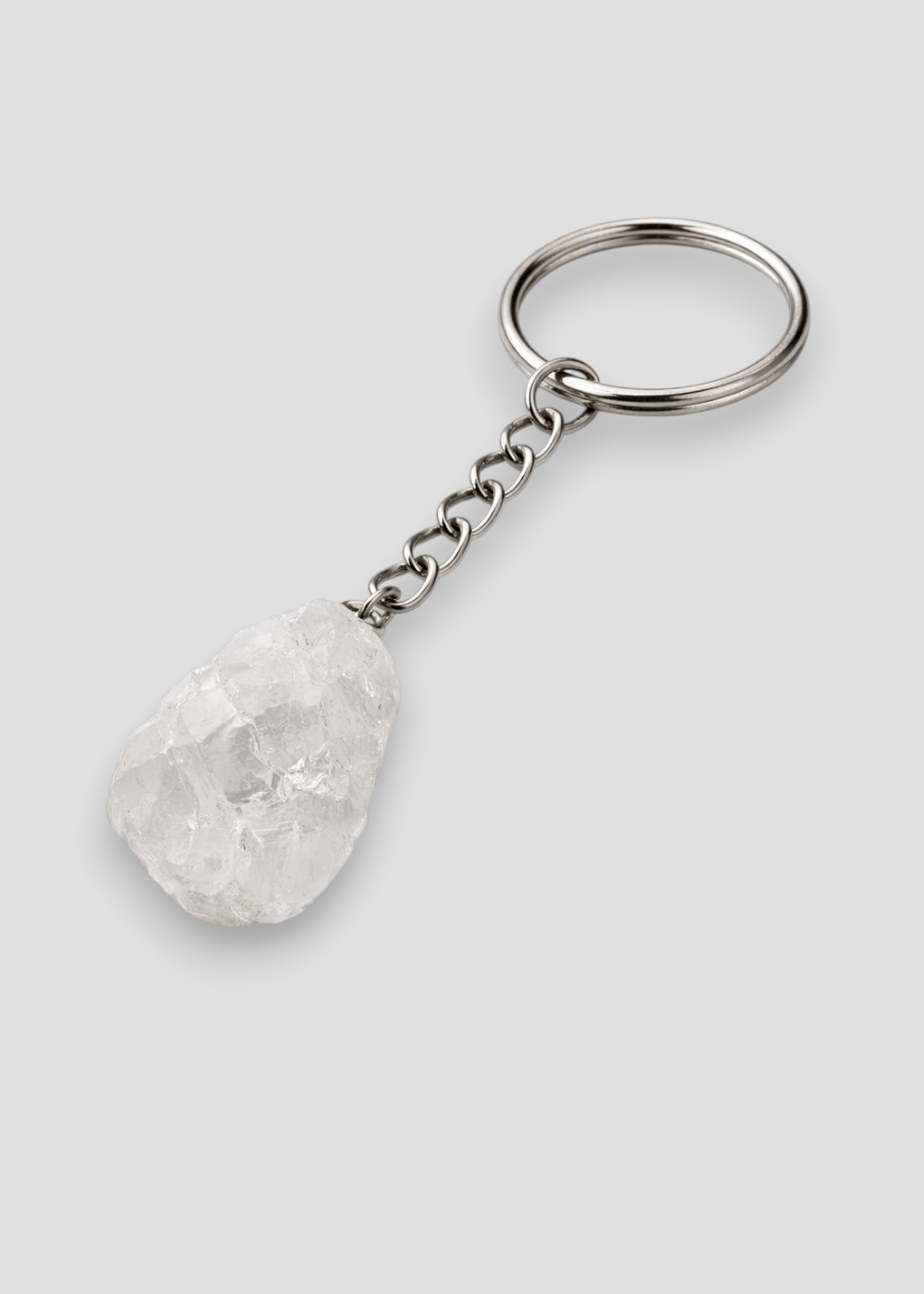 El llavero está montado sobre una resistente anilla metálica de acabado plateado, acompañada de una pequeña cadena que conecta la anilla con el fragmento de cuarzo.