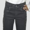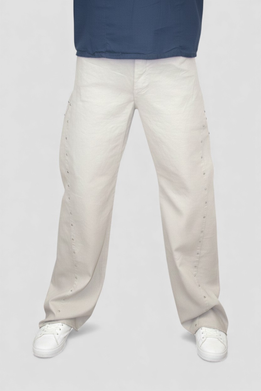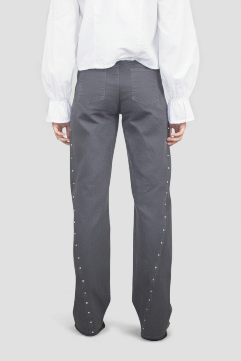Un detalle distintivo de este pantalón es la hilera de pequeños botones metálicos ubicados a lo largo de los costados de ambas piernas, desde la zona de la cadera hasta el bajo, lo que le aporta un toque moderno y decorativo.