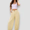 El pantalón bombacho amarillo es ideal para combinar con camisetas básicas, blusas ligeras o tops ajustados, permitiendo crear outfits frescos y modernos.