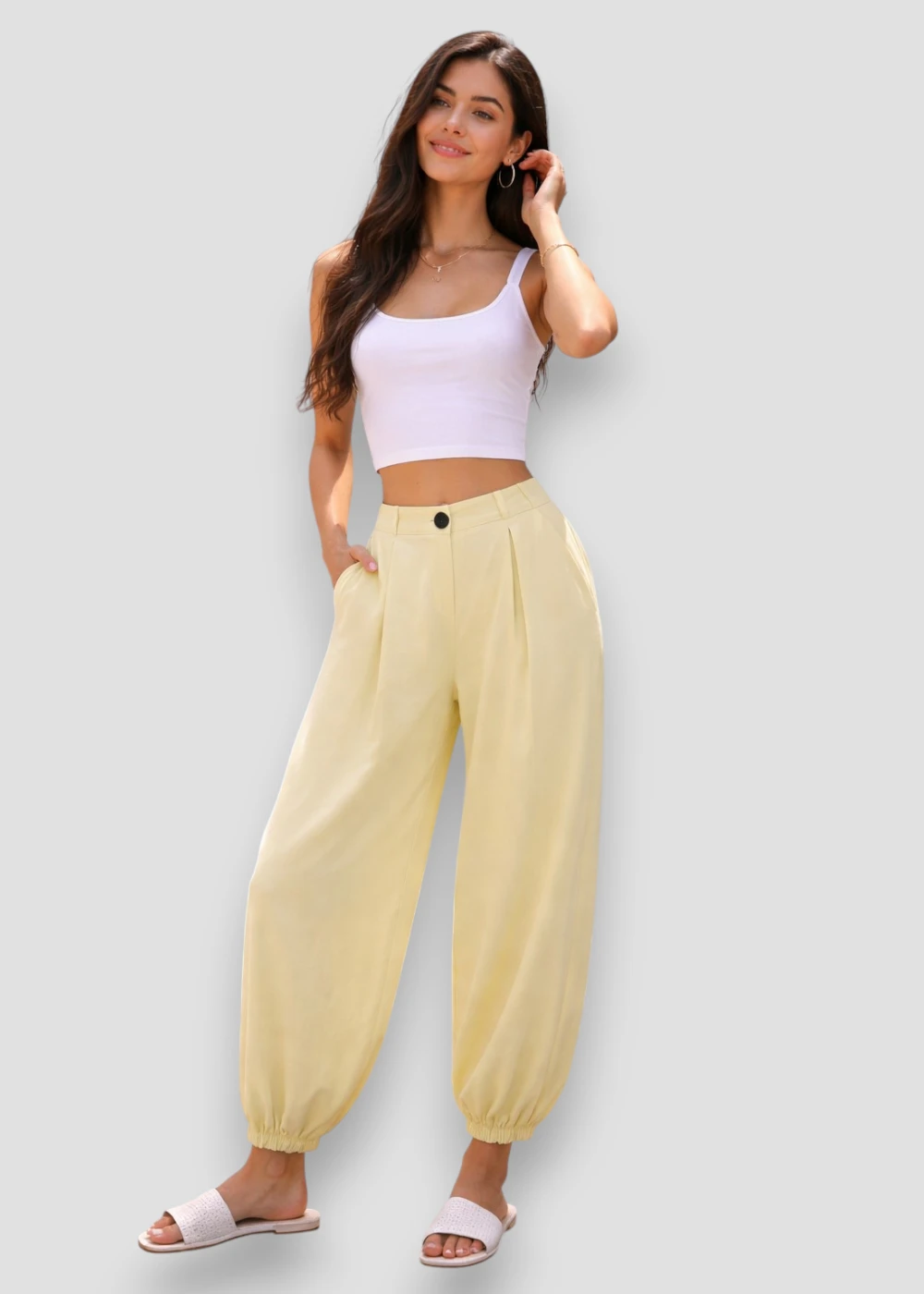 El pantalón bombacho en color amarillo es una prenda fresca, cómoda y con mucho estilo, ideal para quienes buscan un look original sin renunciar a la comodidad.