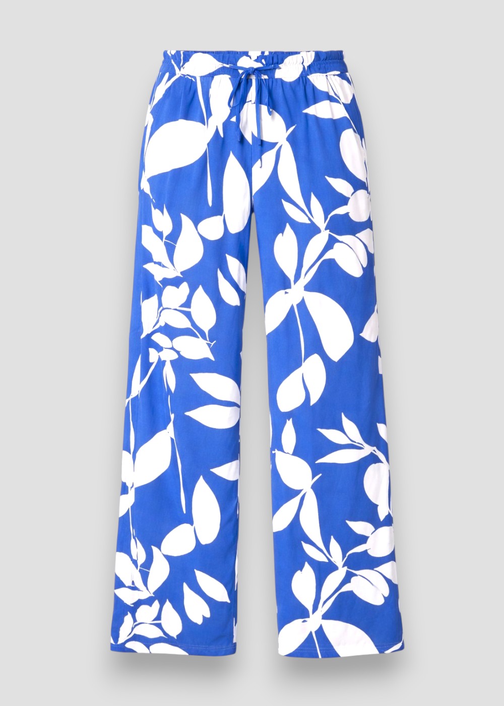 El diseño del pantalón presenta un estampado de hojas grandes y estilizadas, distribuidas de forma armoniosa sobre el tejido.