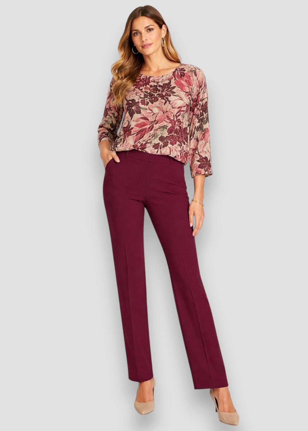 Su color burdeos profundo aporta sofisticación y un aire moderno, convirtiéndolo en una opción ideal tanto para looks de oficina como para conjuntos más informales con un toque chic.