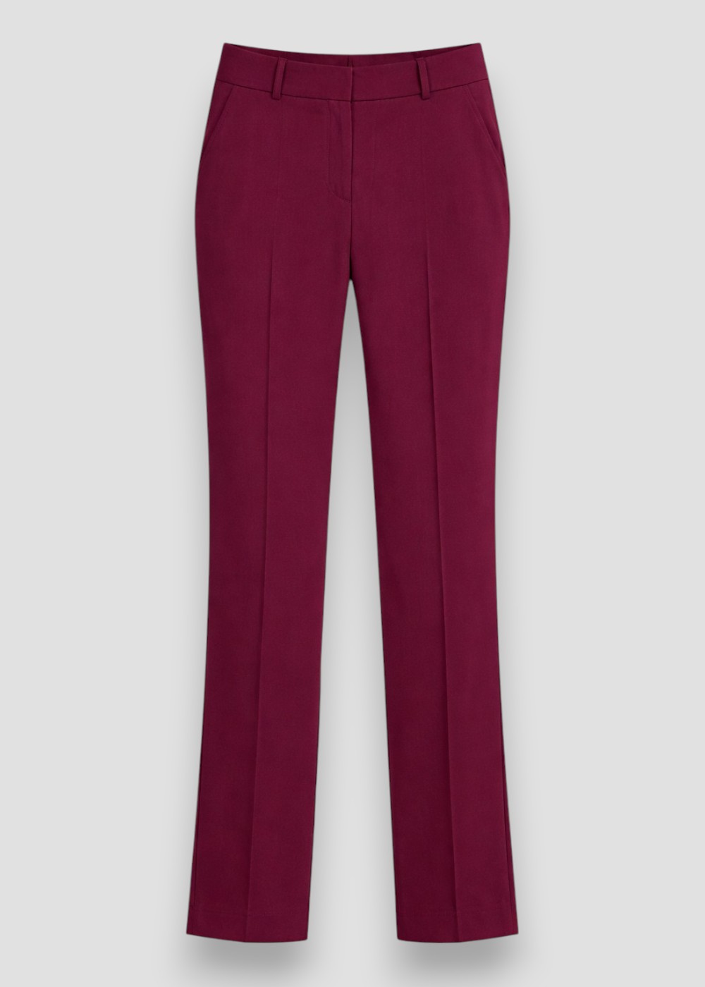 Confeccionado en un tejido de tacto suave y estructura firme, este pantalón destaca por su caída impecable y su acabado liso que realza la silueta.