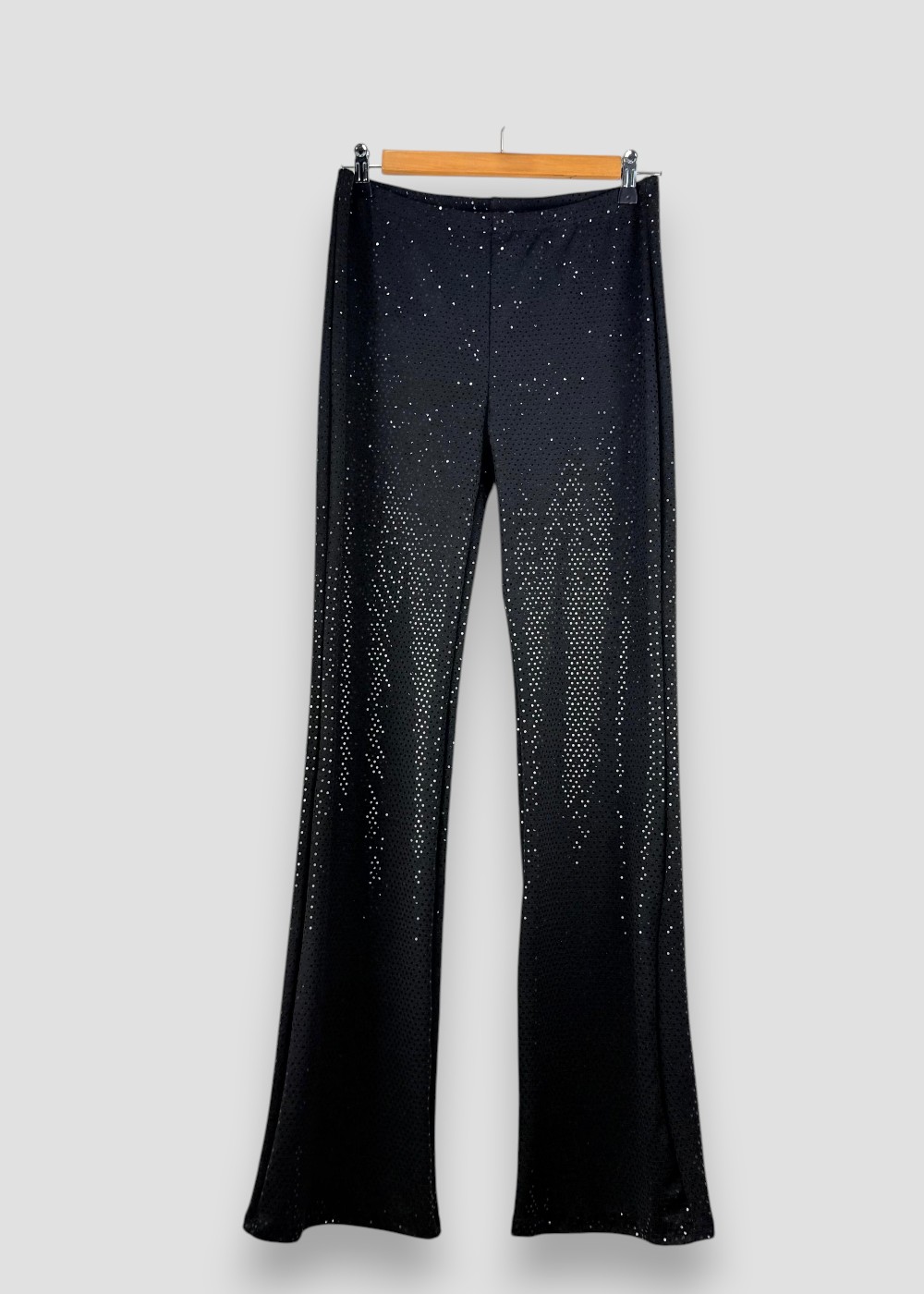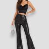 Pantalón negro de lentejuelas con tiro medio y corte ligeramente acampanado. Su diseño brillante y elegante estiliza la figura y es ideal para looks de fiesta o eventos especiales, aportando un toque sofisticado y glamuroso.