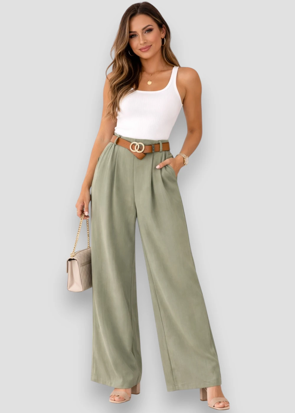 El Pantalón Palazzo Brisa Verde puede combinarse fácilmente con sandalias, tacones, zapatillas o mocasines según el estilo que se desee lograr.